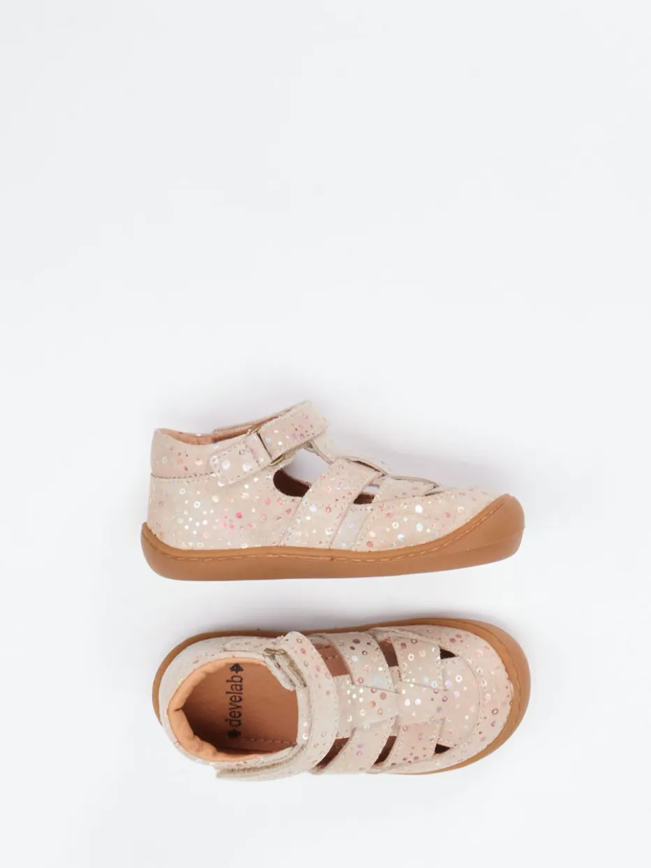Verspielter Komfort für jeden Sommertag.Die Marke develab präsentiert halbgeschlossene Kindersandalen für Alltag und Freizeit. Ob auf dem Spielplatz oder beim Toben im Garten – diese beige Sandale aus geprägtem Veloursleder kombiniert angenehme Haptik mit langlebiger Qualität. Der Klettverschluss ermöglicht einfaches An- und Ausziehen sowie individuelle Anpassung. Farbige Glitzerpunkte in Rosé und Weiß treffen auf eine geschlossene Ferse und flexible Gummisohle mit rutschfestem Profil. Dank natürlicher Barfußform und weicher Polsterung bleiben kleine Füße lange in Bewegung. Ideal zu pastellfarbenen Leggings oder leichten Sommerkleidern. develab steht für detailverliebtes Design mit kindgerechtem Tragekomfort.
