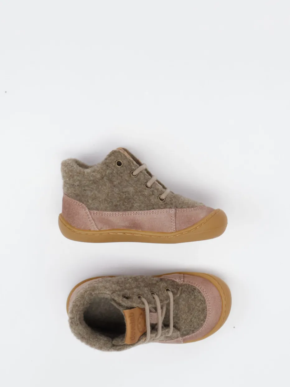 Natürlich warm und kindgerecht gestaltet.Der develab-Lauflernschuh überzeugt mit klassischer Schnürung und kuscheligem Wollfutter. Für erste Ausflüge im Herbst bietet dieser Schuh ein weiches Fußbett und stabile Rundform. Gefertigt aus Veloursleder mit samtiger Oberfläche und ergänzendem Wollfilz, zeigt er sich in einem harmonischen Mix aus Beigebraun, Altrosa und Honigbraun. Die flexible Gummisohle und die verstärkte Zehenkappe unterstützen sicheren Stand und Bewegungsfreiheit. Logos auf der Zunge und am seitlichen Patch setzen dezente Markenakzente. Inspiriert von Scandi Kidswear, bestens kombinierbar zu Wollwalk-Overalls. develab bietet funktionalen Komfort mit klarer Naturästhetik.