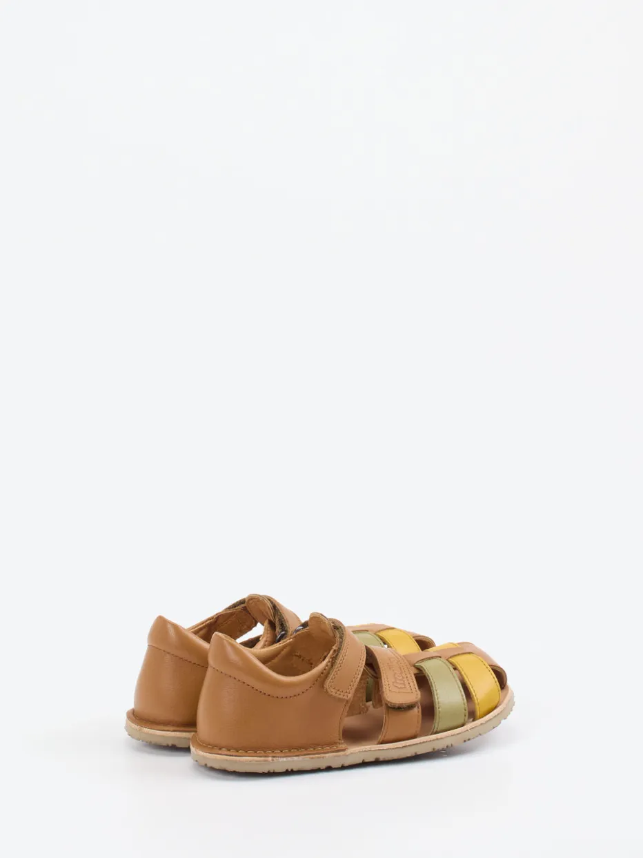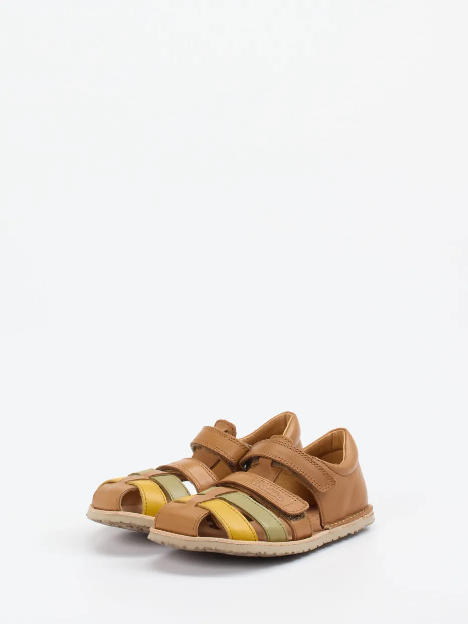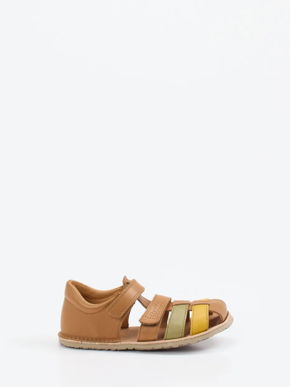 Natürliche Farben, funktionales Design.Froddo präsentiert eine modisch-minimalistische Kindersandale für warme Tage. Ideal für aktive Sommerabenteuer überzeugt dieses Modell durch weiches Kalbleder mit matter Oberfläche und farblich abgesetzte Riemen in Cognacbraun, Senfgelb und Olivgrün. Die offene Silhouette mit geschlossener Fersenkappe sorgt für Stabilität, während Klettverschlüsse ein unkompliziertes An- und Ausziehen ermöglichen. Die flexible Gummisohle mit Vibram-Profil garantiert guten Halt auf verschiedenen Untergründen. Inspiriert vom Retro-Trend und Soft Color Blocking bietet die Sandale kindgerechten Tragekomfort mit spielerischem Twist. Gesundes Laufgefühl und stilvolle Leichtigkeit – typisch Froddo.