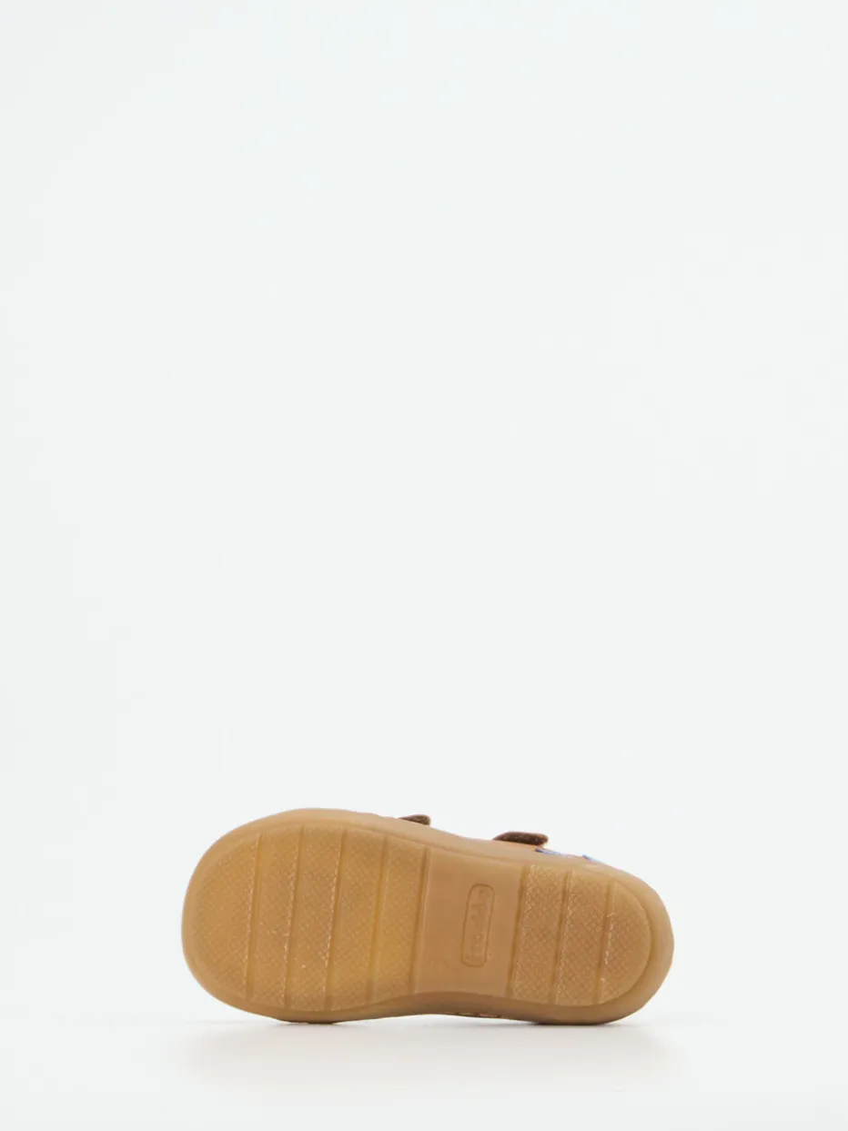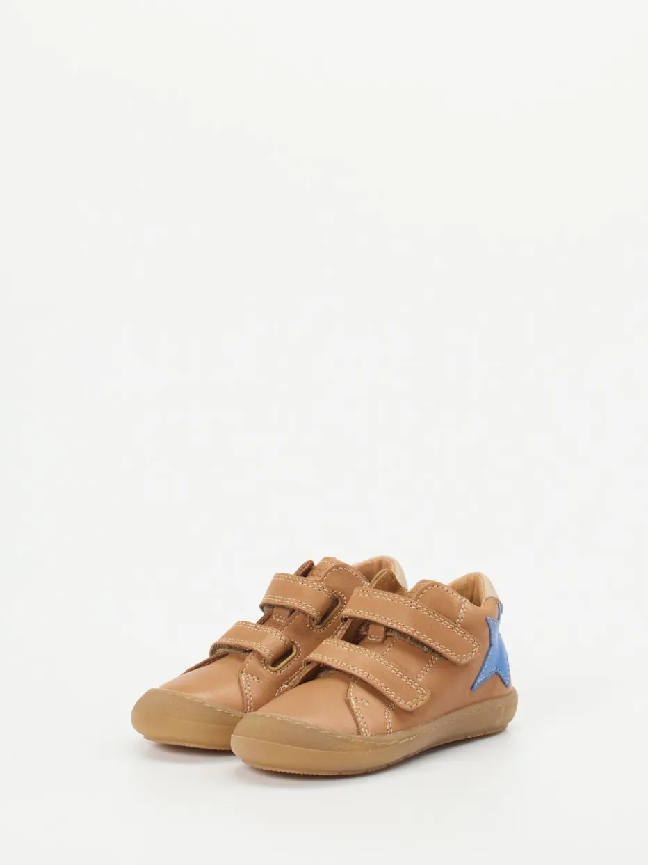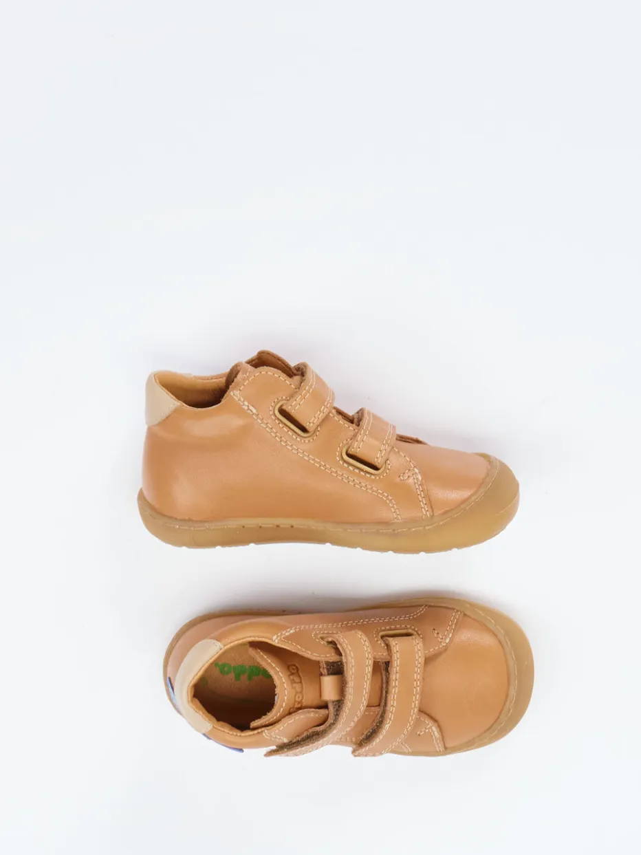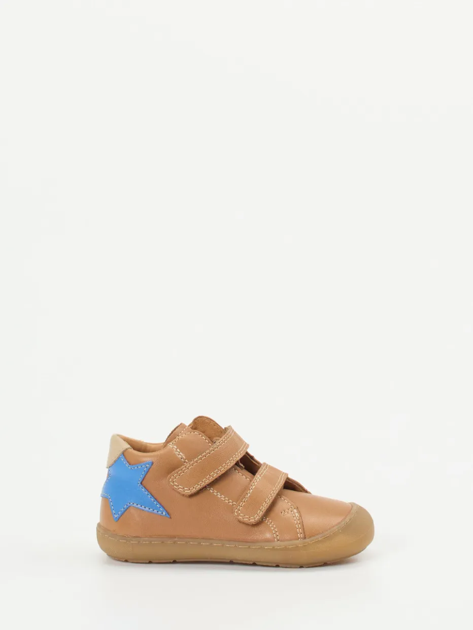 Stabiles Laufen lernen mit Stil.Die Marke Froddo präsentiert einen durchdachten Lauflernschuh für kleine Entdeckerinnen und Entdecker. Ideal für Kita und Alltagsabenteuer: Das hellbraune Kalbleder wirkt matt und wurde aufwendig mit sichtbaren Kontrastnähten sowie einer markanten Stern-Applikation in Kornblumenblau veredelt. Dank gepolstertem Einstieg und zwei praktischen Klettverschlüssen lässt sich der knöchelhohe Schuh leicht anziehen. Die profilierte Gummisohle unterstützt erste Schritte mit sicheren Tritten auf unterschiedlichen Untergründen. Inspiriert vom skandinavischen Minimalismus, passt das Design besonders gut zu lässigen Looks. Froddo steht für kindgerechte Qualität mit durchdachter Funktionalität.