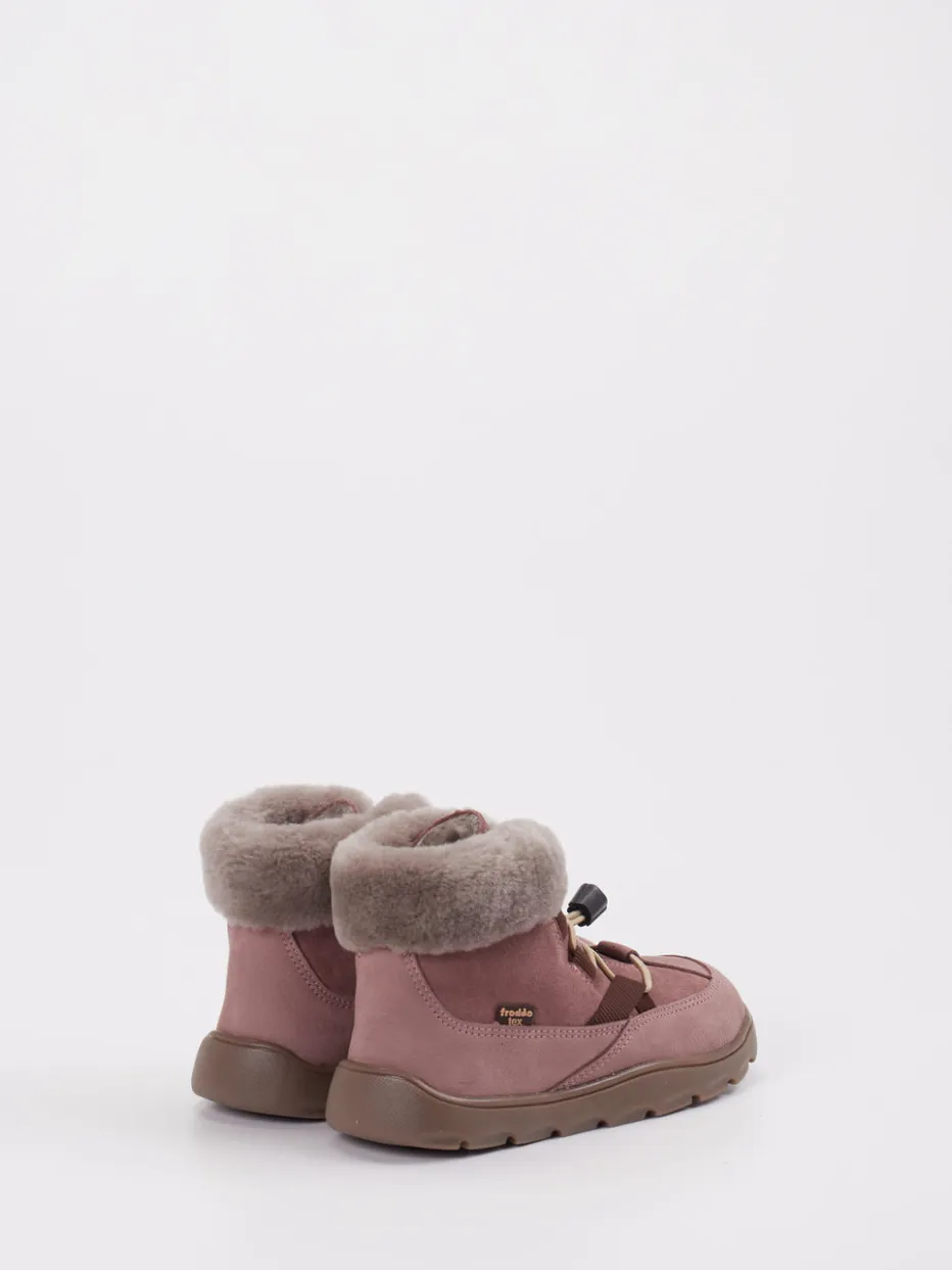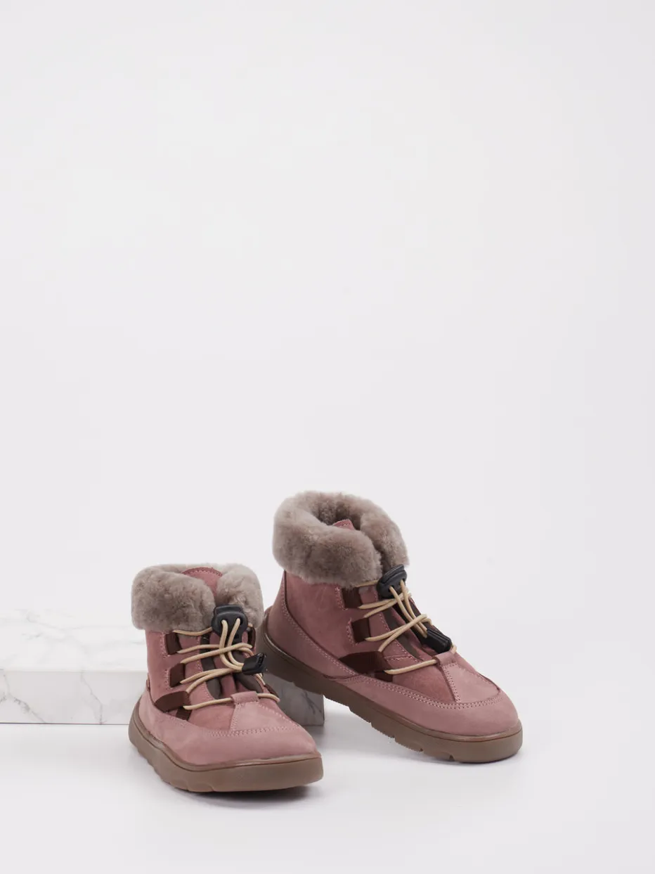 Das altrosafarbene Nubukleder ist samtig angeschliffen und überzeugt mit einer matten Oberfläche. Ein Kunstfellkragen sowie das warme Wollfutter sorgen für angenehme Wärme. Die runde, kompakte Silhouette wird durch ein praktisches Schnellschnürsystem ergänzt, während die rutschfeste Gummisohle sicheren Halt bietet. Farblich Ton-in-Ton gestaltet, fügt sich das Modell stilvoll in skandinavisch inspirierte Outfits ein und passt zu Thermohosen oder Winterjacken gleichermaßen.
