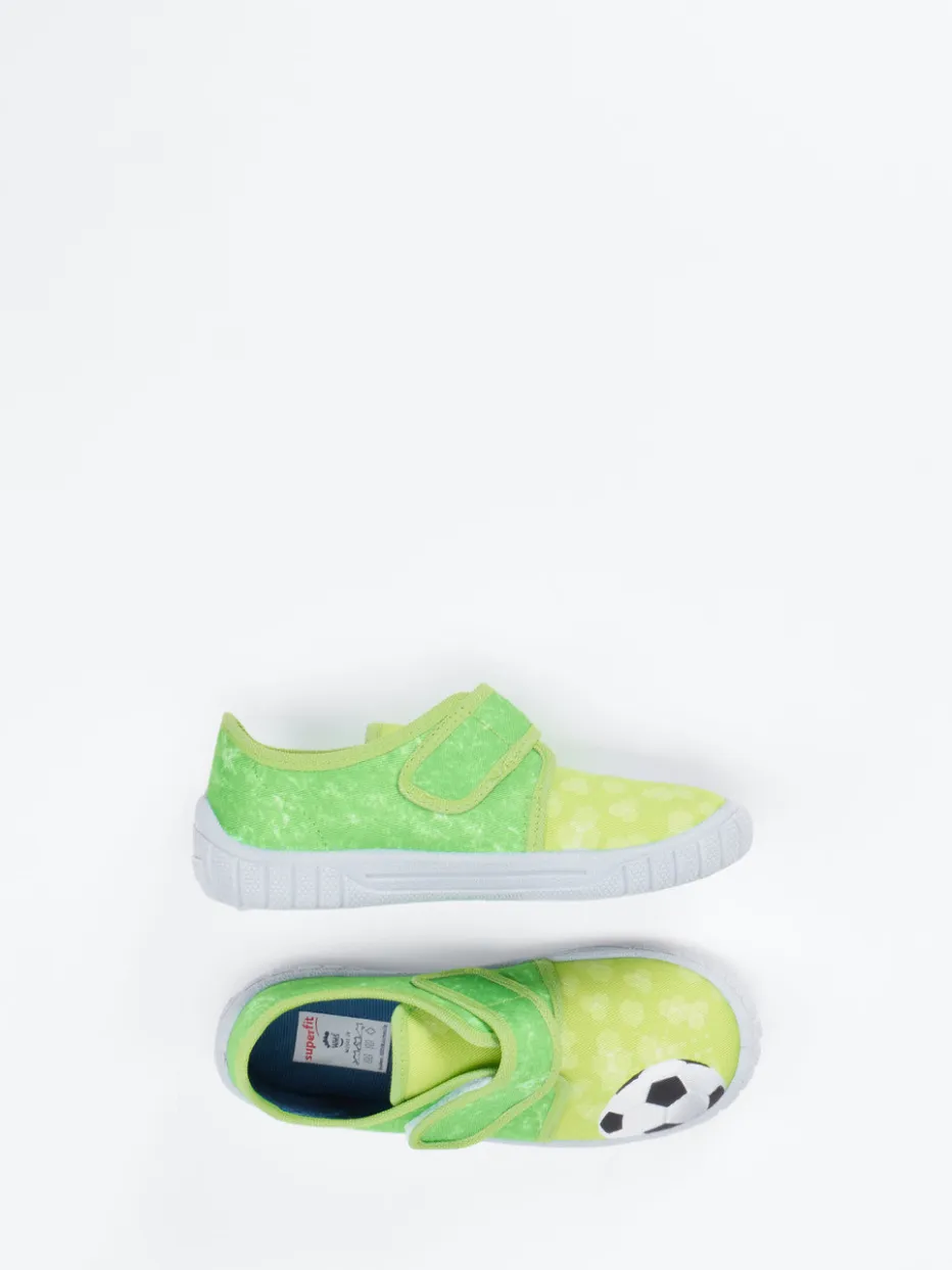 Superfit präsentiert einen grasgrünen Kinder-Hausschuh mit Klettverschluss und fröhlichem Motiv.