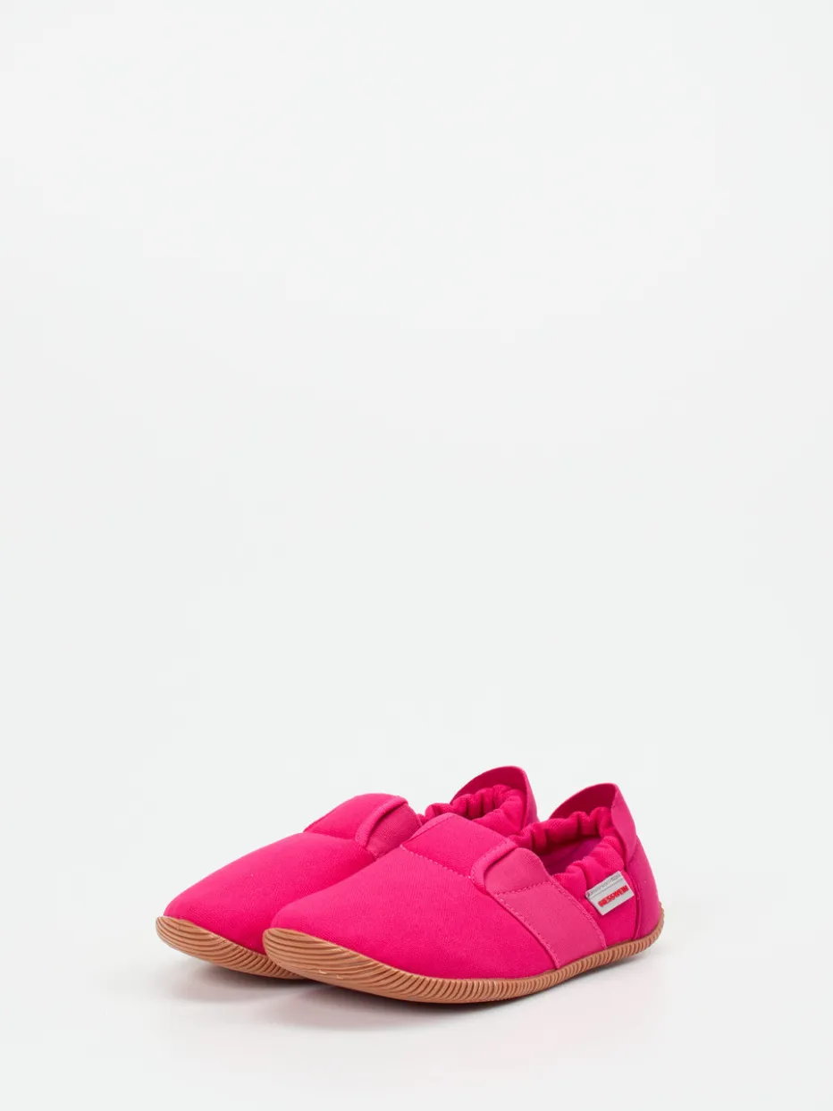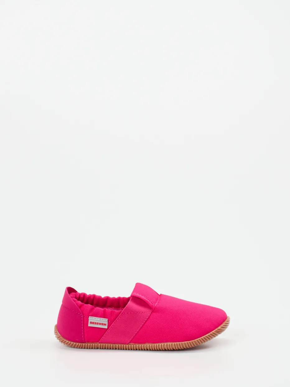 Der atmungsaktive Hausschuh aus pinkfarbenem Textil bietet durch den elastischen Einstieg und die rutschfeste Sohle kindgerechten Komfort für drinnen.