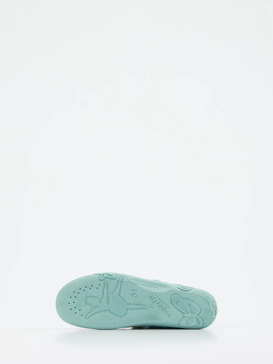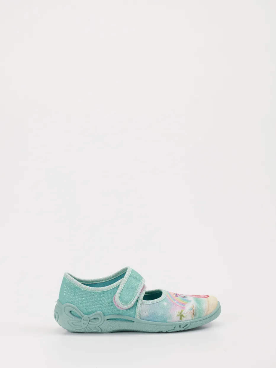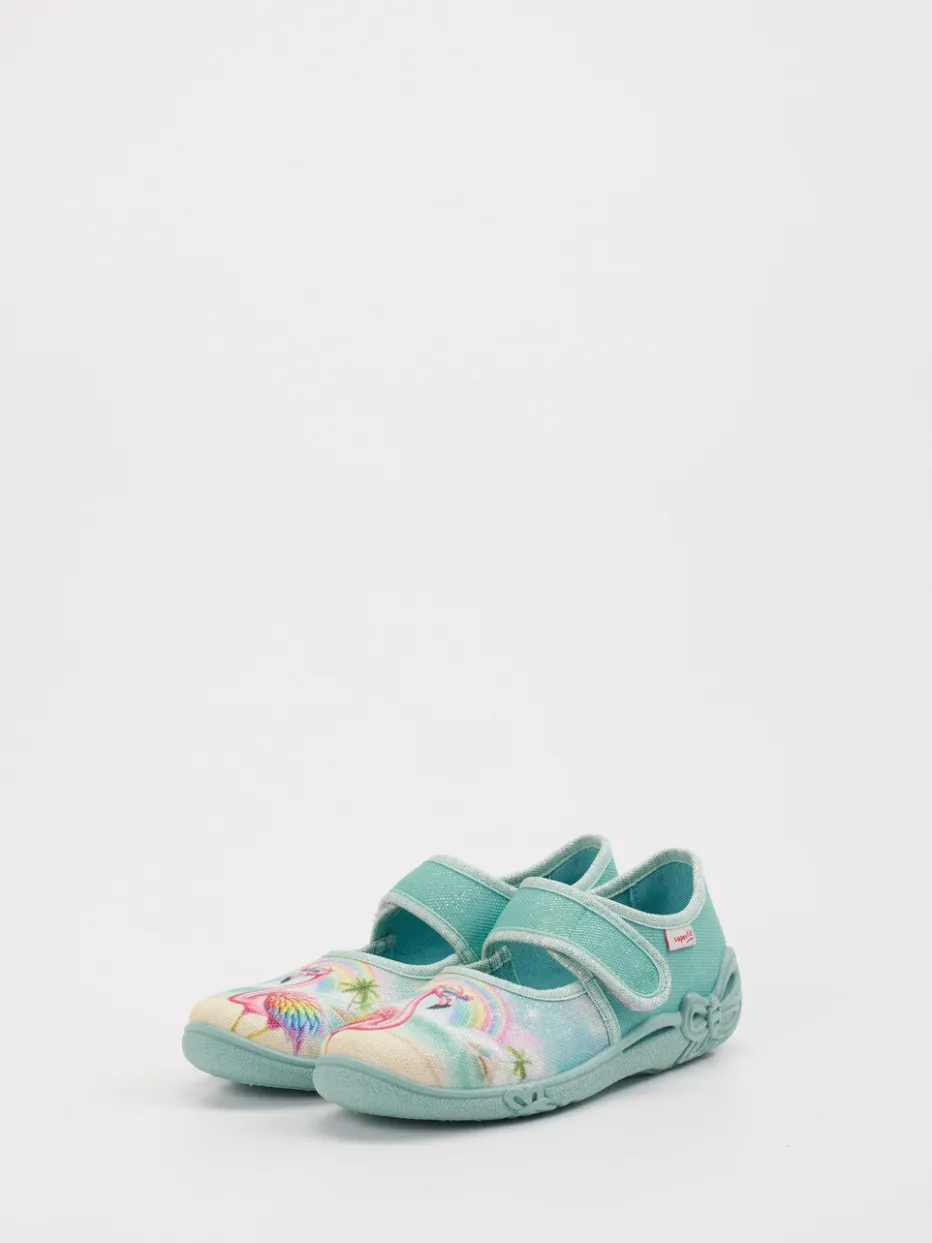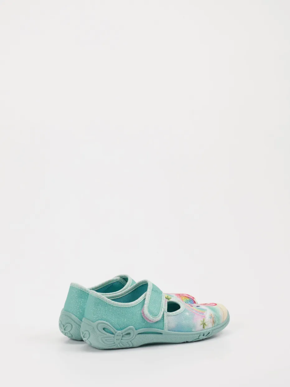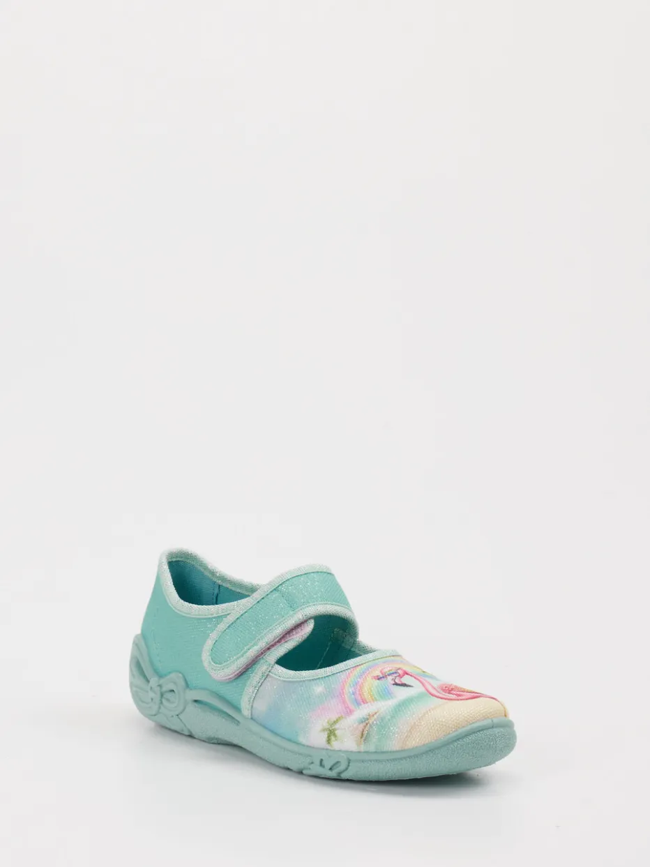Ideal für Kita, Spielzimmer oder Zuhause: Dieser Hausschuh besteht aus Textil, wirkt durch Oberflächen mit dezentem Glanz besonders lebendig und zeigt dabei einen liebevollen Flamingo-Regenbogen-Print mit Glitzereffekt. Mintgrün dominiert als frische Hauptfarbe, kombiniert mit Cremeweiß und Rosa in verspielten Akzenten. Die klassische, runde Form wird durch einen praktischen Klettverschluss ergänzt, während die profilierte PU-Sohle mit Schmetterlingsprägung rutschhemmend wirkt. Eingebettet in aktuelle Pastelltrends SS24 passt er ideal zu Kuschelsocken oder Leggings.