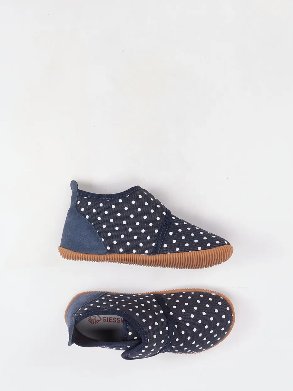 Fürs Zuhause gemacht.Giesswein setzt mit diesen Kinder-Hausschuhen auf Komfort und kindgerechtes Design. Wenn es im Kinderzimmer gemütlich zugeht, wird dieser Hausschuh zum Lieblingsbegleiter. Das Obermaterial aus weichem Textil wird durch eine samtige Veloursleder-Fersenkappe stabilisiert, während ein punktierter Print in Dunkelblau und Weiß einen verspielten Akzent setzt. Der knöchelhohe Schnitt mit Klettverschluss ermöglicht ein selbstständiges An- und Ausziehen, und die flexible Gummisohle mit rutschhemmender Struktur bietet sicheren Halt auf glatten Böden. Perfekt zur Retro-inspirierten Kindermode – ideal kombinierbar mit Pyjama oder Kuschelsocken. Bewährter Giesswein-Komfort für entspannte Kinderfüße.
