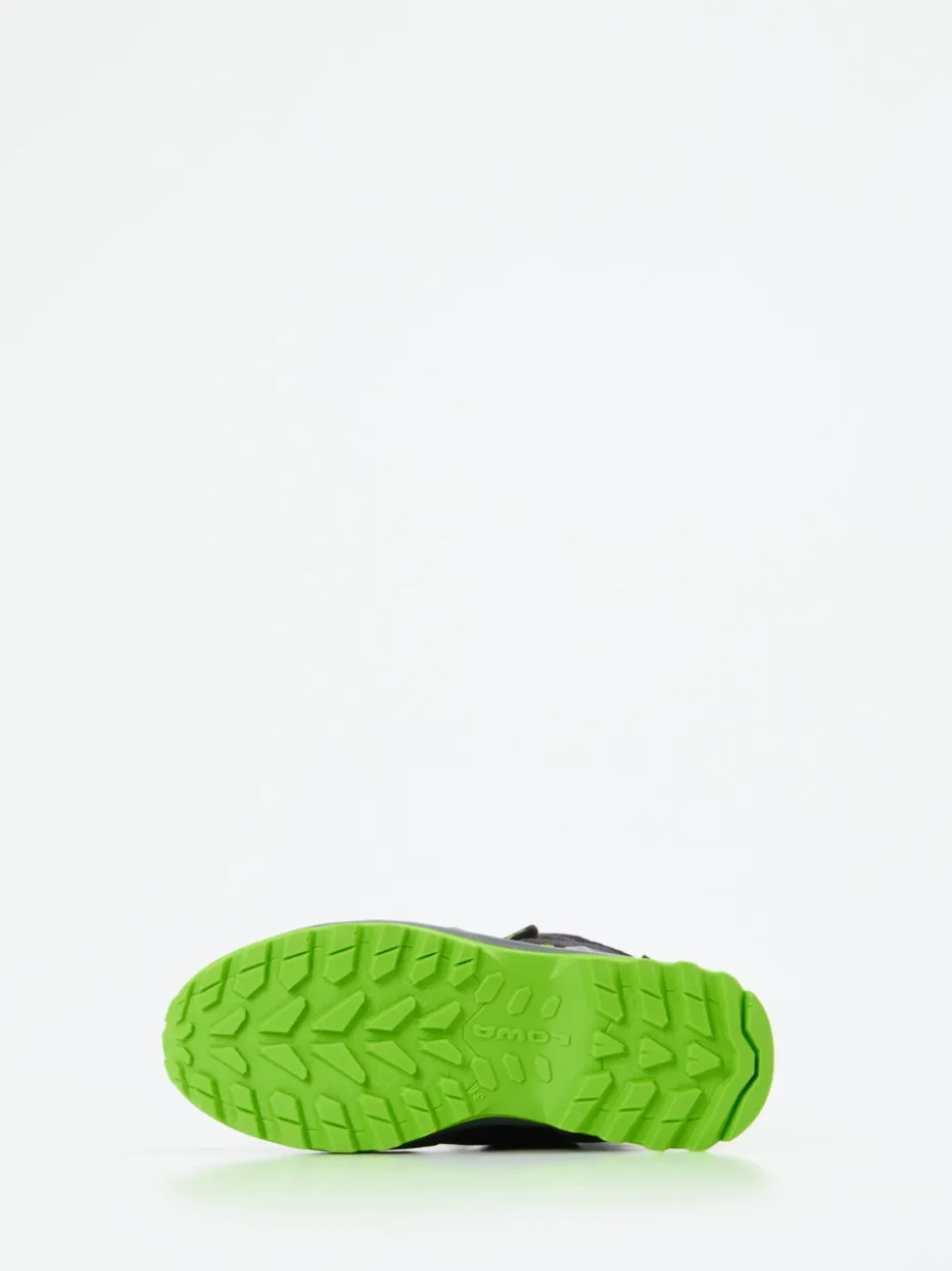 Für aktive Abenteuer bei jedem Wetter.Die Marke Lowa präsentiert einen funktionalen Kinder-Wanderstiefel mit durchdachten Outdoor-Eigenschaften. Windiges Herbstwetter oder matschiger Waldboden – dieser Mid-Cut-Stiefel aus Veloursleder, ergänzt um atmungsaktives Mesh, bietet mit wasserdichter GORE-TEX-Ausstattung zuverlässigen Schutz. Das anthrazit-schwarze Design wird durch neongrüne Akzente und reflektierende Details modern akzentuiert. Zwei Klettverschlüsse sorgen für schnelles An- und Ausziehen, während die griffig profilierte PU-Sohle für Stabilität auf jedem Untergrund steht. Ein warmer Textilfuttereinsatz unterstützt den Komfort bei kühlen Temperaturen. Perfekt zur Funktionsjacke oder Outdoorhose. Langlebiges Kinderschuhkonzept mit Fokus auf Robustheit, Passform und Sichtbarkeit.