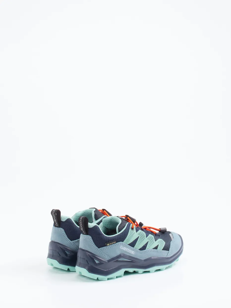 Funktion für jedes Outdoor-Abenteuer.Lowa präsentiert sportlich-kompakte Wanderschuhe für Kinder im Low-Cut-Design. Ideal für aktive Tage im Freien: Die Schuhe kombinieren atmungsaktives Mesh mit samtig angeschliffenem Veloursleder und wasserdichter GORE-TEX-Membran. Auffällige Highlights in Mintgrün mit kontrastfarbener, orangefarbener Schnellschnürung und reflektierenden Details sorgen für Sichtbarkeit und Stil. Die griffige, dunkelblaue Gummisohle bietet sicheren Halt auf unebenem Gelände. Trendgerecht durch Gorpcore-Einflüsse, gleichzeitig funktional und alltagstauglich. Perfekte Balance aus technischer Performance und modernem Outdoor-Styling, wie man es von Lowa erwartet.