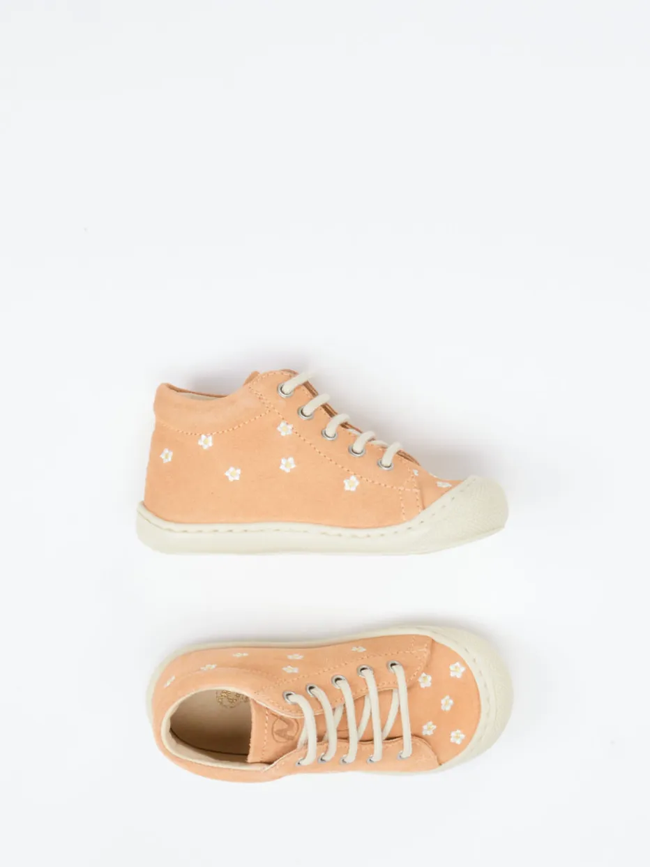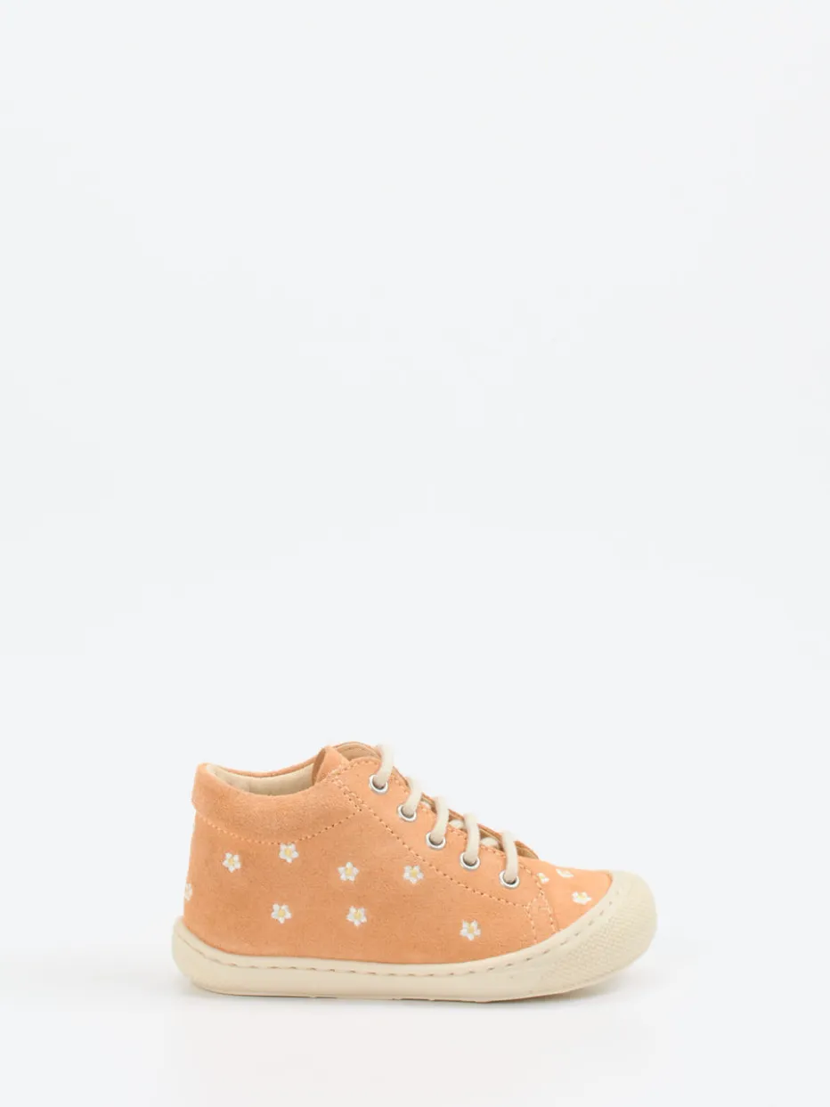 Blumenfreude zum ersten Schritt.Naturino bringt mit diesem liebevoll gestalteten Lauflernschuh einen idealen Begleiter für drinnen und draußen. Weiches Veloursleder in zartem Apricot umgibt den Kinderfuß angenehm sanft. Weiße Blumenstickereien, Ton-in-Ton-Nähte und eine rundkappige Silhouette sorgen für verspielte Akzente. Die beige Gummisohle gibt sicheren Halt bei den ersten Schritten, während das beigefarbene Lederfutter komfortabel einbettet. Die Schnürung und verstärkte Zehenpartie zeigen durchdachte Alltagstauglichkeit. Inspiriert von Skandi-Kindermode liegt das Modell stilistisch im Trend der Saison. Perfekt kombinierbar mit pastelligen Outfits. Hochwertige Verarbeitung für kleine Füße mit Bewegungsdrang – stilvoll umgesetzt von Naturino.