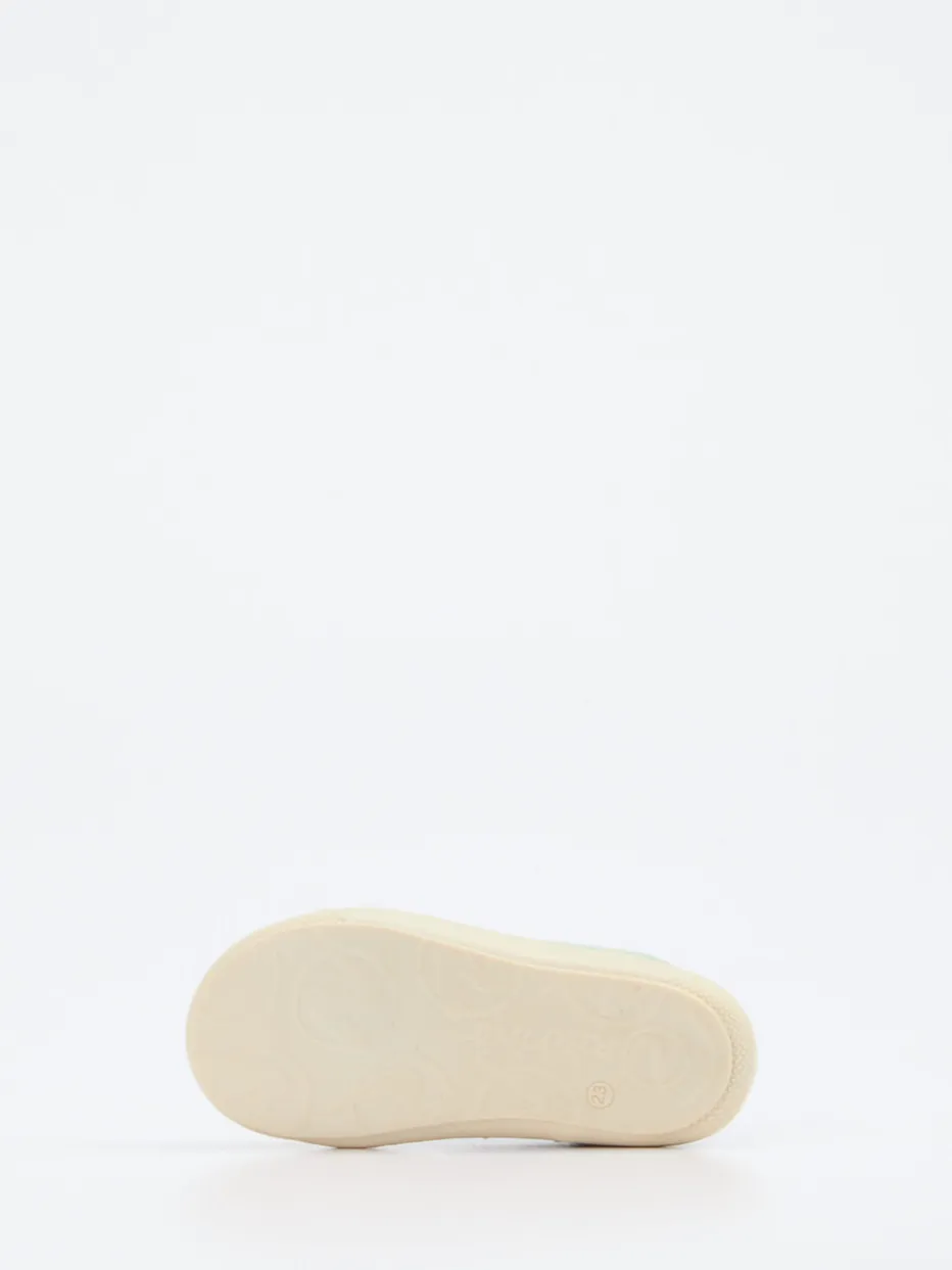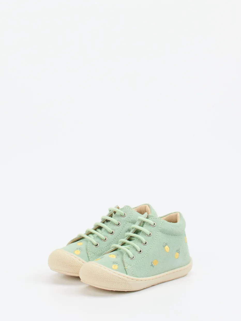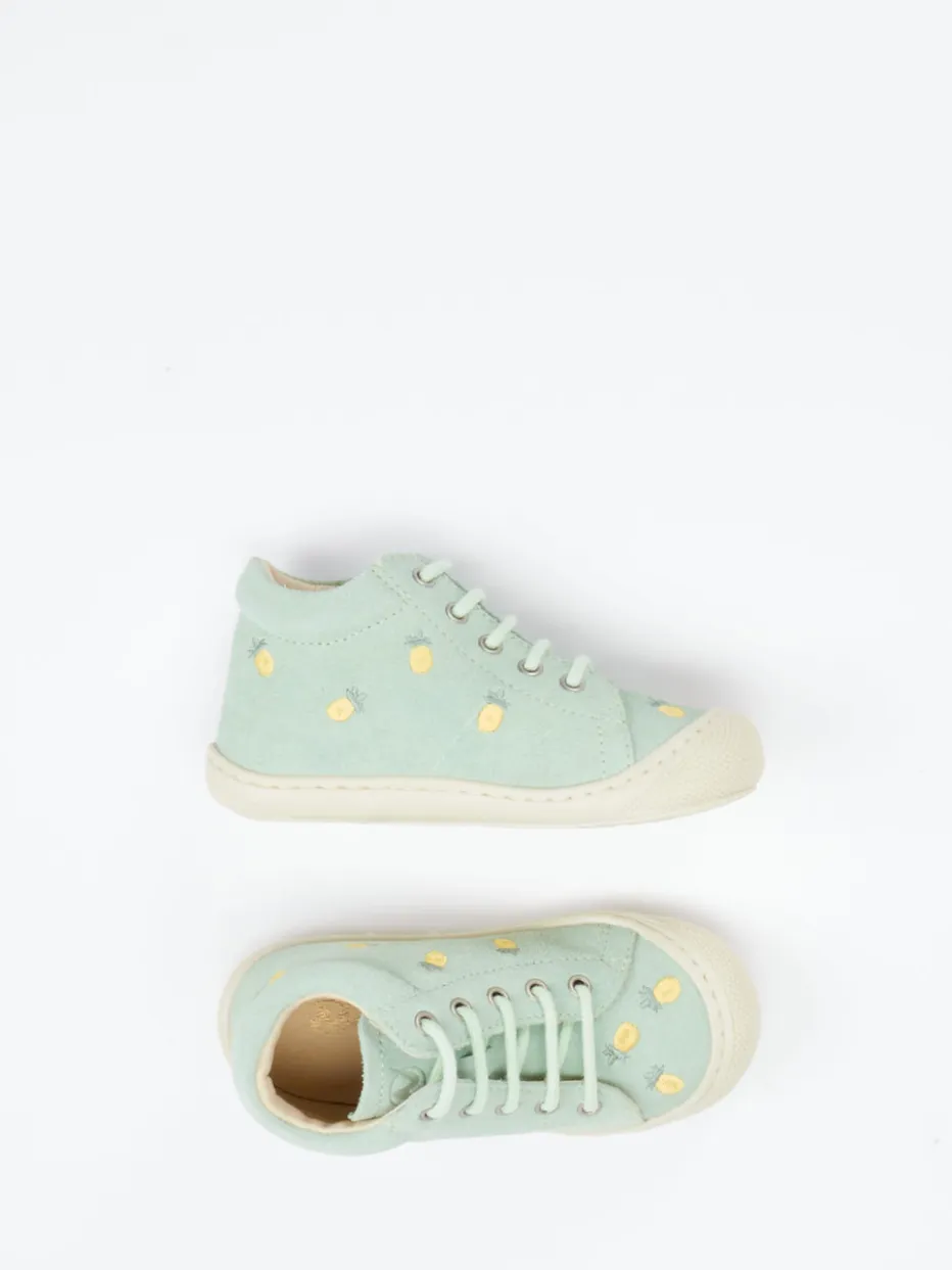 Ob bei den ersten Schritten im Garten oder entspannten Stunden zu Hause – das weiche Veloursleder, samtig angeschliffen, unterstützt zarte Füße zuverlässig. Der mintgrüne Farbton wird durch pastellgelbe und beige Akzente ergänzt, während gestickte Ananas-Motive auf der Sneakerform für gute Laune sorgen. Schnürung und verstärkte Zehenpartie geben sicheren Halt. Skandinavisch inspiriert und durch fröhliche Fruit Motifs absolut trendsicher, ergänzt das Modell sommerliche Outfits ideal.