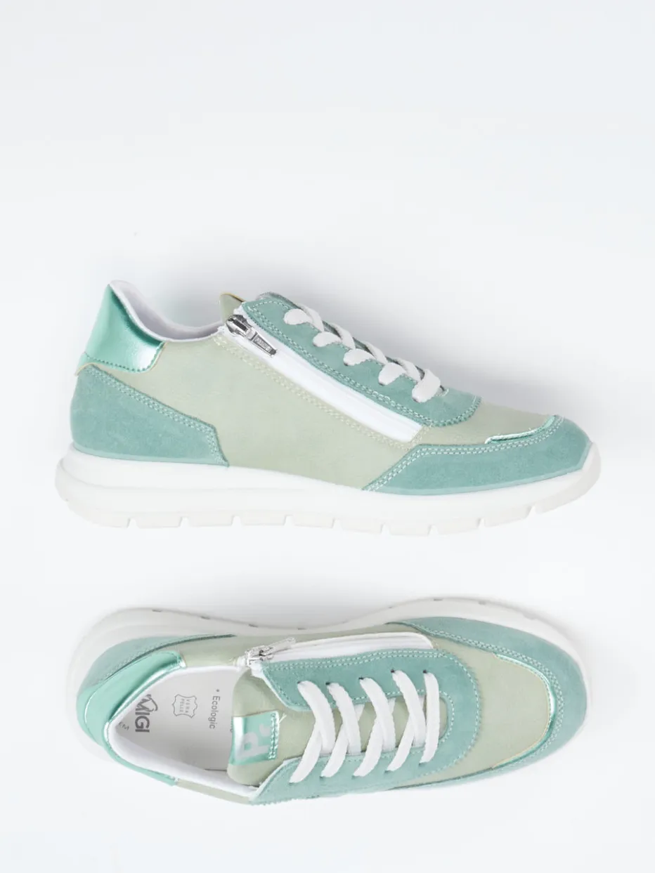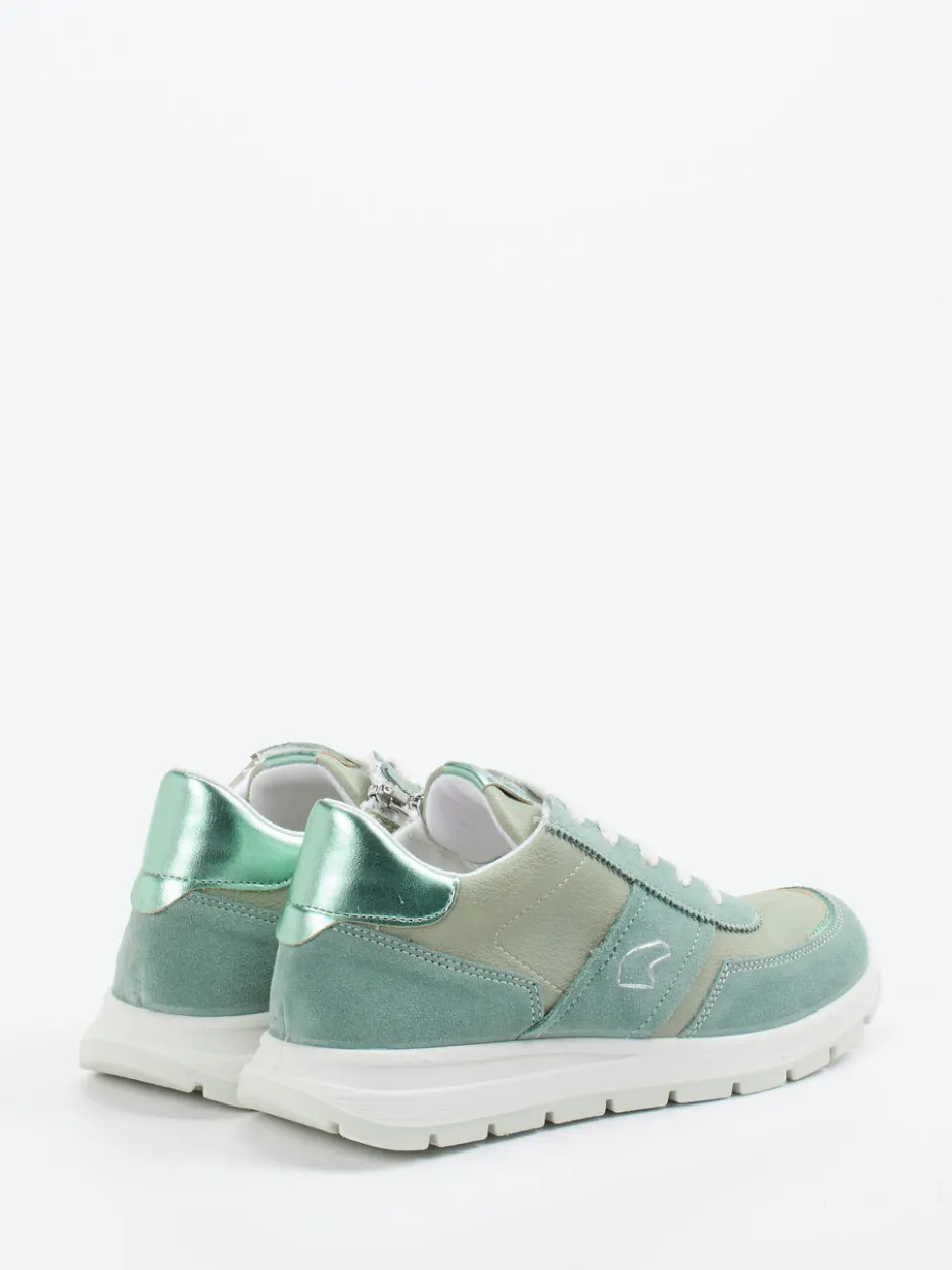 Trendfarbe trifft auf Komfort.Primigi präsentiert einen sportlich-schlichten Sneaker für Damen mit modischem Anspruch. Ideal für entspannte Stadttage oder den spontanen Ausflug: Das Modell kombiniert hochwertiges Veloursleder mit samtiger Oberfläche und textilen Partien. Salbeigrün dominiert als Trendfarbe und wird durch mintgrüne sowie weiße Akzente ergänzt. Die klassische, abgerundete Silhouette, dekorative Nähte und ein metallischer Fersenpatch setzen optische Highlights. Dank seitlichem Reißverschluss ist schnelles Anziehen garantiert; eine profilierte PU-Sohle sorgt für Trittsicherheit. Inspiriert von Streetwear und Minimalismus, greift der Look aktuelle Pastelltrends der Saison SS24 auf. Ein modisch-funktionaler Begleiter mit Primigi-Komfortanspruch.