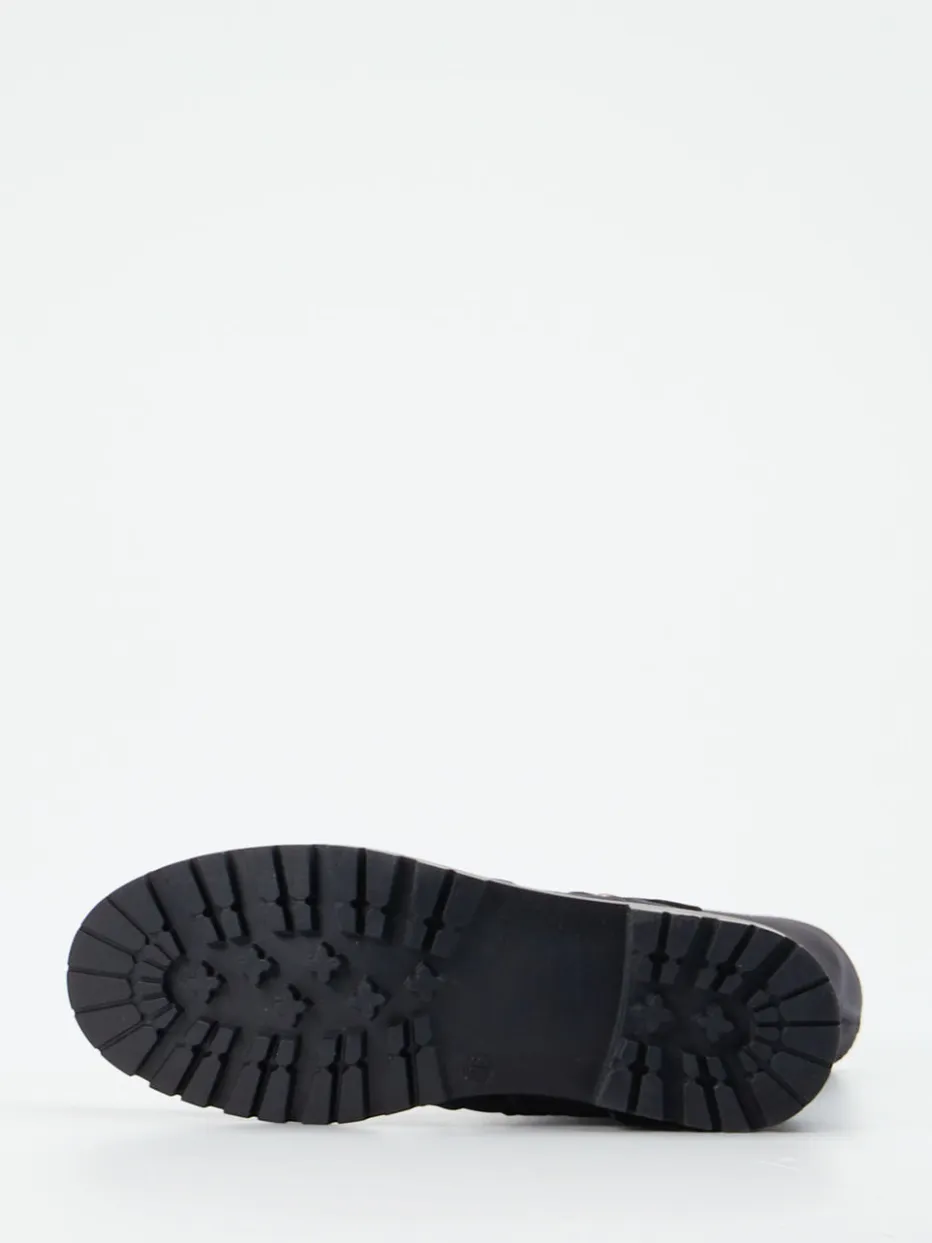 Ob auf dem Schulweg oder beim winterlichen Spaziergang – dieser Stiefel aus samtig angeschliffenem Nubukleder schützt zuverlässig vor Kälte. Das tiefdunkle Blau trifft auf eine antikgoldfarbene Metallschnalle, während das weiße Wollfutter von innen für gemütliche Wärme sorgt. Die gerade Schaftform mit Innenreißverschluss erleichtert den Einstieg und die Gummisohle mit grobem Profil bietet Trittsicherheit auf rutschigem Untergrund. Der klare Utility-Look folgt dem Trend zu funktionaler Wintermode.