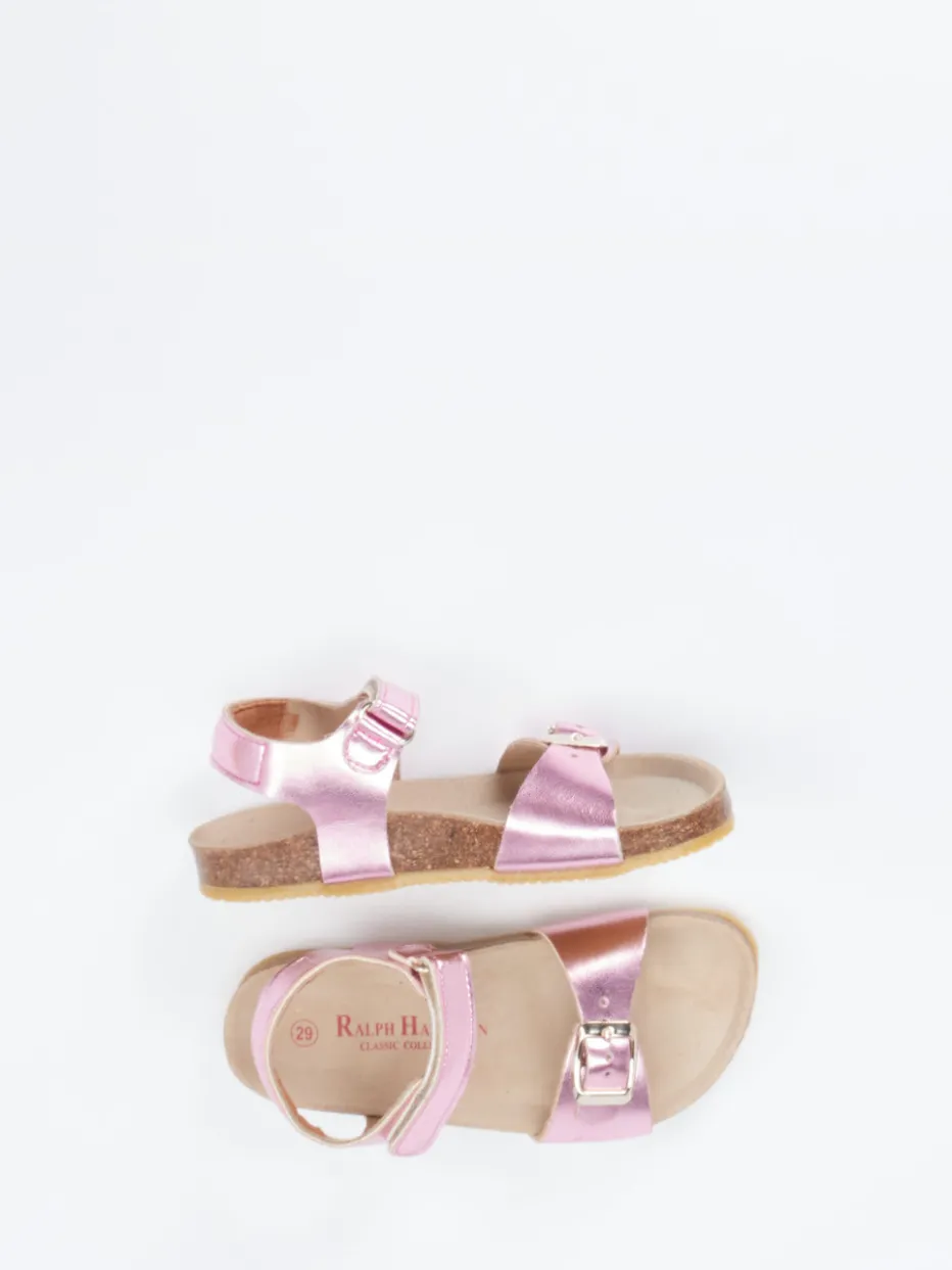 Funkelt im Sommerlicht.Die Marke Ralph Harrison Classic präsentiert hier eine detailverliebte Mädchensandale für Alltag und Urlaub. Dank verstellbaren Riemen am Vorderfuß und um die Ferse sorgt der Klett-Schnallenverschluss für sicheren Halt – auch beim Toben. Das schimmernde Metallic-Finish in Rosa verleiht der offenen Silhouette eine verspielte Eleganz. Die strukturierte Gummisohle ist rutschhemmend, während das ergonomische Korkfußbett angenehmen Komfort bietet. Mit fein glänzender Oberfläche und silberfarbenen Schnallen trifft Funktion auf Trendbewusstsein. Ideal kombinierbar zu Shorts oder Kleidern. Hochwertige Auswahl für komfortorientierte Kinderfüße mit Stilanspruch.