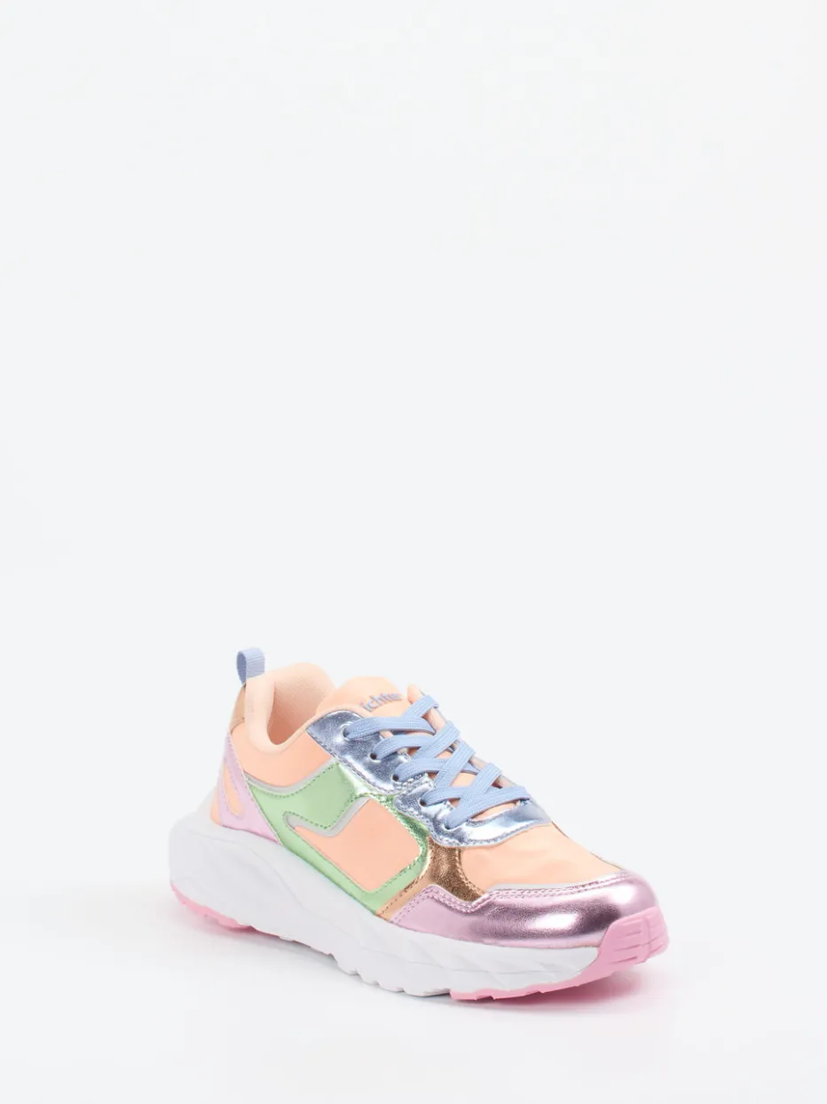 Ob beim Stadtbummel oder auf dem Schulhof – dieser Sneaker sorgt durch seine robuste Gummisohle und die auffällige Multicolor-Metallic-Optik garantiert für Aufsehen. Das glänzende Textilmaterial ist in Pfirsichrosa gehalten und wird von sanften Tönen wie Lavendel und Pastellblau ergänzt. Die chunky Silhouette greift den aktuellen Y2K- und Streetwear-Trend auf, während praktische Details wie die Zuglasche und verstärkte Fersenkappe Alltagstauglichkeit beweisen. Besonders harmonisch in Kombination mit einer leichten Kinderjacke in Pastellfarben.