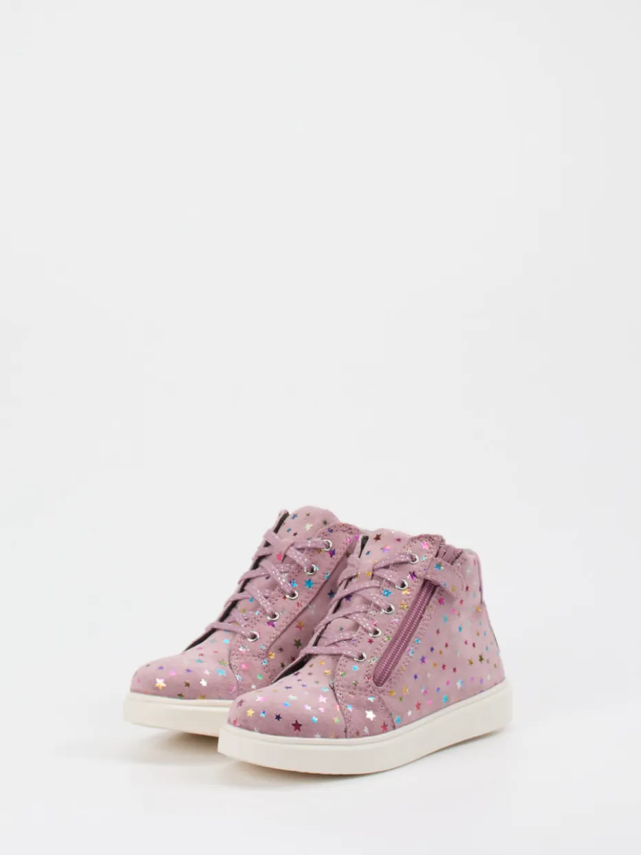 Richter präsentiert mit diesem High-Top Sneaker ein verspieltes Modell für Kinderfüße. Der knöchelhohe Schuh verbindet weiches Veloursleder mit samtiger Haptik in Altrosa und einem angenehmen Textilfutter in Grau. Auffällige Glitzersterne, ein glänzender Metallic-Fersenbesatz und der seitliche Reißverschluss setzen optische Highlights und sorgen für kinderleichte Handhabung. Die Schnürung unterstützt die individuelle Anpassung, während die weiße Gummisohle rutschhemmenden Halt bietet – perfekt für Freizeit, Kita oder Spielplatz. Ob zu Jeansjacke oder Pastell-Rucksack: ein Trendfavorit in Y2K-Ästhetik.