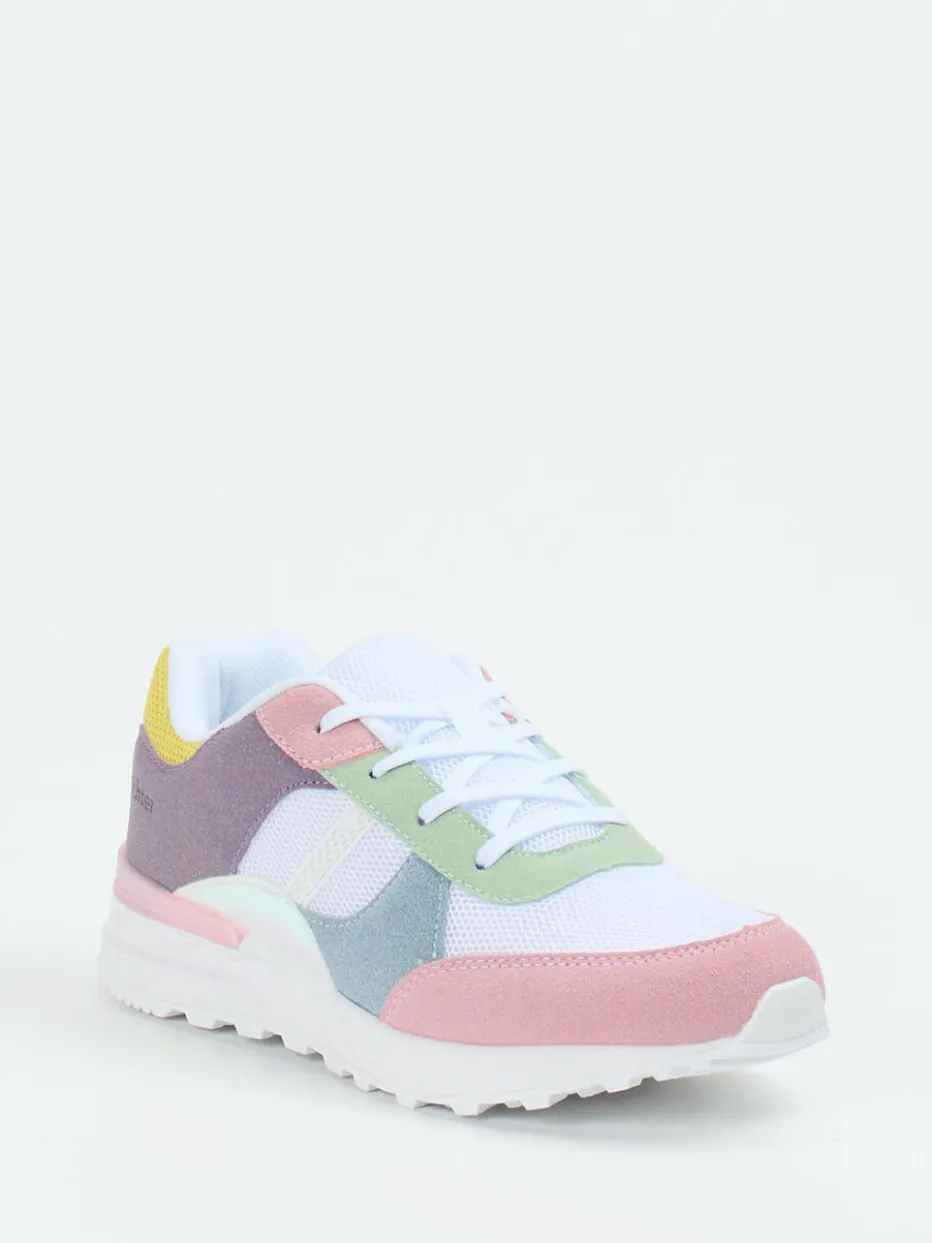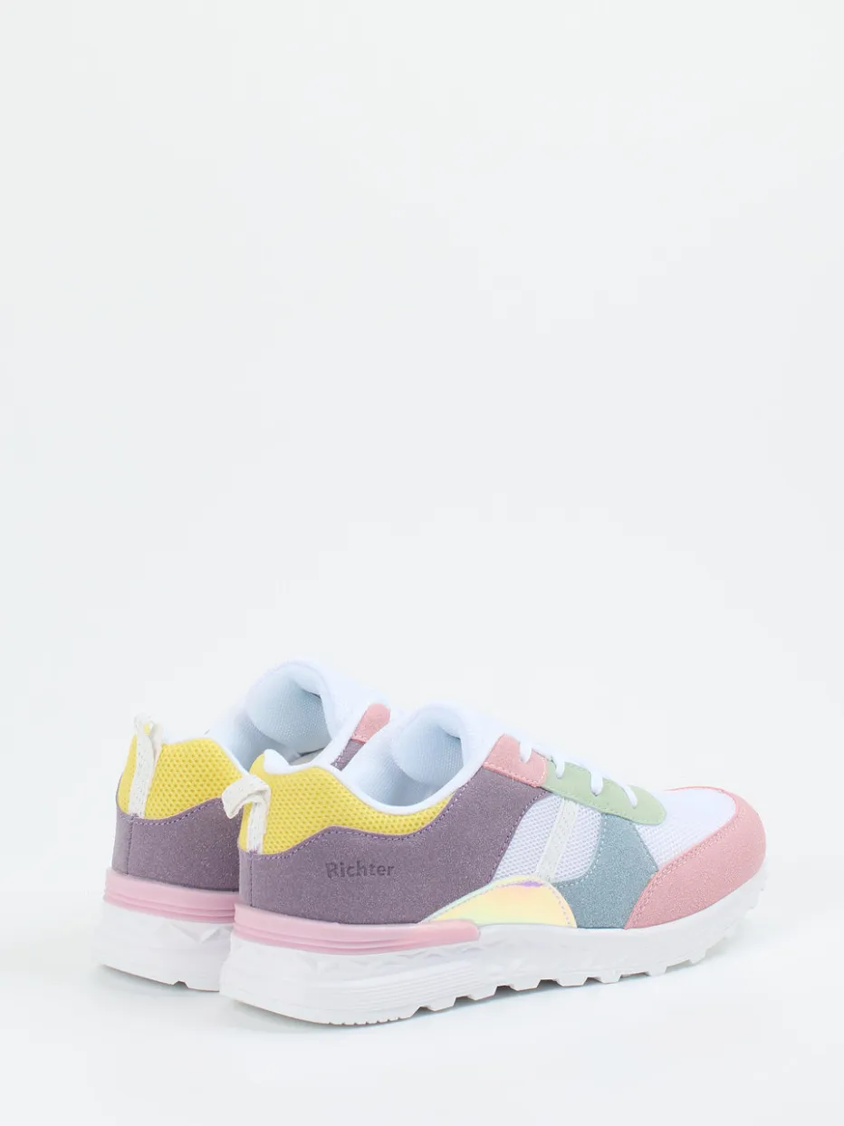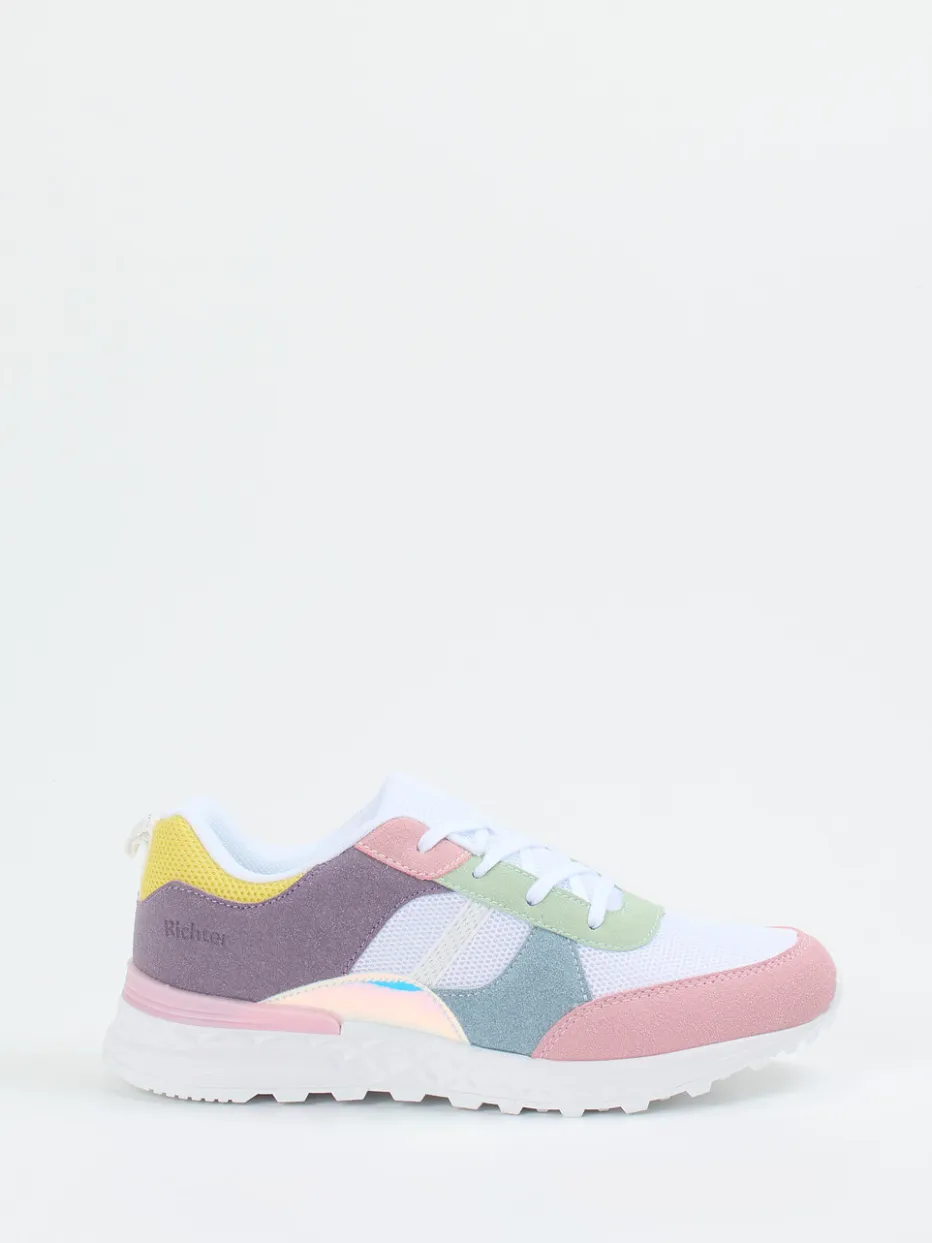 Farbstark durch den Frühling.Richter präsentiert einen sportiven Low-Top Sneaker speziell für Kinder. Wenn der Alltag nach Bewegungsfreiheit verlangt, punktet dieser Sneaker mit atmungsaktivem Meshtextil und samtig anmutenden Velourslederimitat-Details. Das weiße Obermaterial wird durch Patches in Rosa, Grün, Blau, Lavendel und Gelb ergänzt – ideal abgestimmt auf die Pastelltrends der Saison. Eine weiße, griffig profilierte Gummisohle sorgt für sicheren Halt, während eine weiche Polsterung am Schaftrand und eine klassische Schnürung den Komfort erhöhen. Irisierende Akzente an der Ferse und eine dezente Zuglasche setzen moderne Highlights. Stilsicher und bequem – ein frühlingsleichter Schuh mit Trendgarantie von Richter.