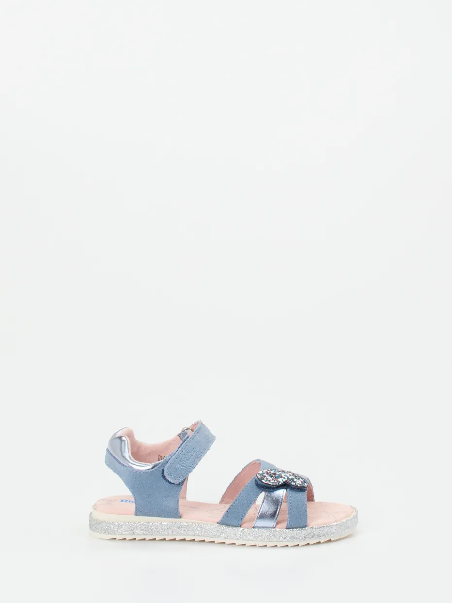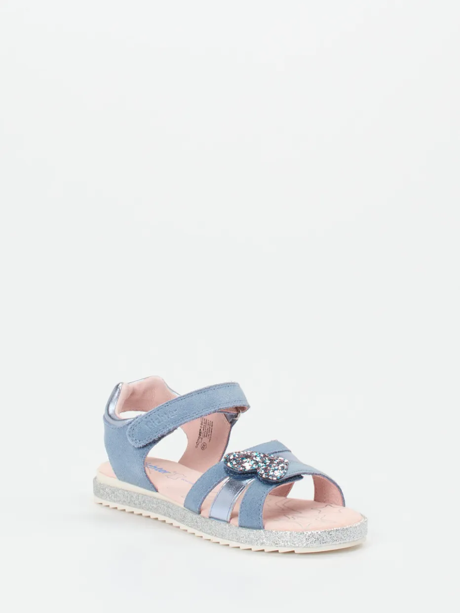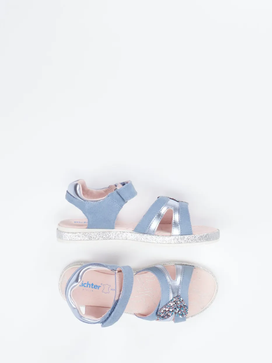 Für glitzernde Sommerabenteuer.Die Marke Richter präsentiert diese offen gearbeitete Klettsandale für Kinder. Ideal für sonnige Tage beim Stadtbummel oder am Strand: Das hellblaue Veloursleder besticht durch eine weich-glänzende Oberfläche, ergänzt durch Akzente aus Metallicleder. Glitzerbesatz entlang der Sohle und die dekorative Herz-Applikation heben das Modell optisch hervor. Zwei verstellbare Klettverschlüsse sorgen für einfaches Anziehen und sicheren Halt. Die leichte Gummisohle mit Profilstruktur bietet Stabilität, während das lederbezogene Fußbett für ein angenehmes Klima sorgt. Perfekt kombinierbar mit pastellfarbenen Sommerkleidern. Kindgerechter Stil trifft auf funktionalen Komfort – typisch Richter.