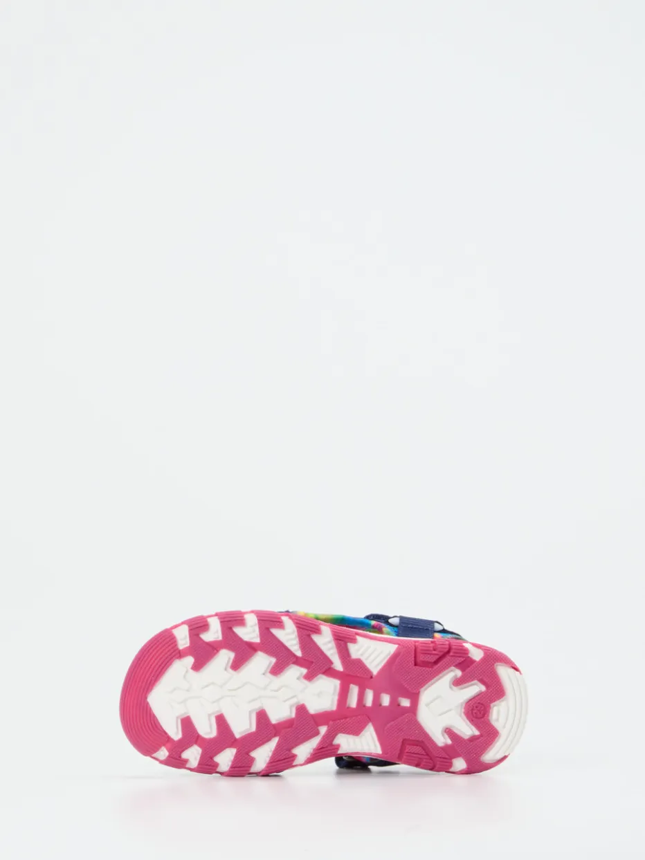 Ob für Ausflüge im Sommer oder spielerische Abenteuer im Alltag: Das Textilmaterial mit matt strukturierter Oberfläche wird von einem weichen Neopren-Innenfutter begleitet, das gepolsterten Halt bietet. Das dominante Dunkelblau wird durch leuchtendes Pink und Türkis in einem Multicolor-Muster aufgefrischt, ergänzt von Herz-Applikationen und kontrastierenden Nähten. Zwei Klettverschlüsse und eine flexible Gummisohle mit griffigem Outdoor-Profil bieten sicheren Halt auf wechselndem Untergrund. Das Design orientiert sich an farbenfroher Kinderfreizeitmode und funktionaler Kidswear.