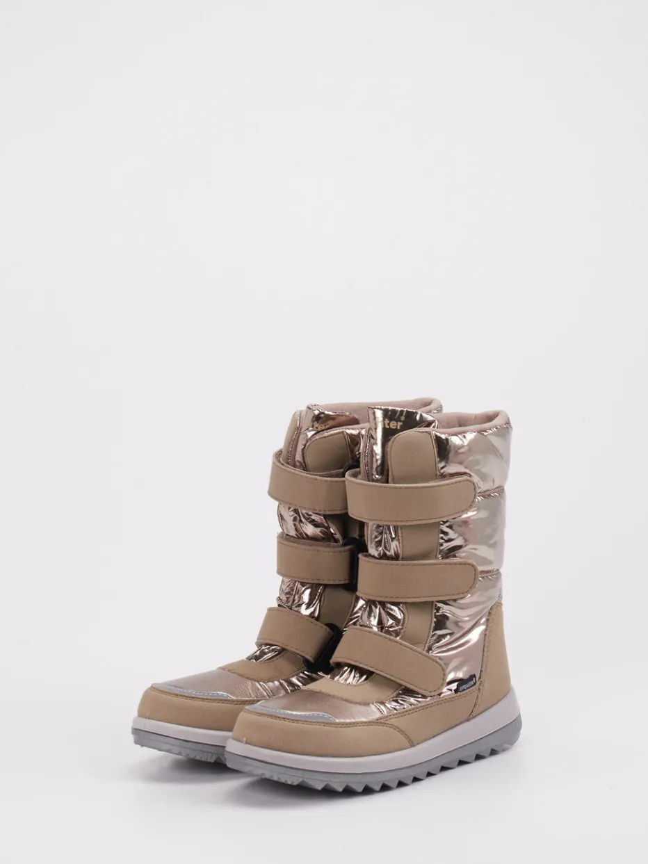 Ideal für Alltagsabenteuer oder Outdoor-Aktivitäten bei Winterwetter: Das Textil-Obermaterial punktet mit einem schimmernden Metallic-Finish, das champagner-beige Farbspiel verleiht modische Raffinesse. Praktische Klettverschlüsse erleichtern das Anziehen, die hohe Silhouette schützt zusätzlich vor Kälte. Eine rutschfeste Gummisohle mit Sternprofil sorgt für sicheren Stand auf rutschigem Untergrund. Reflektierende Details erhöhen zusätzlich die Sichtbarkeit im Straßenbild. Trendiger Gorpcore-Look macht den Stiefel zu einem Highlight funktionaler Kidswear.