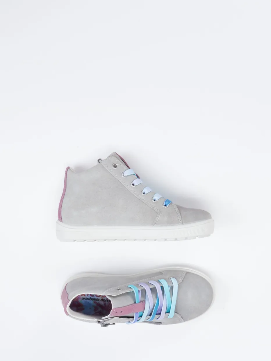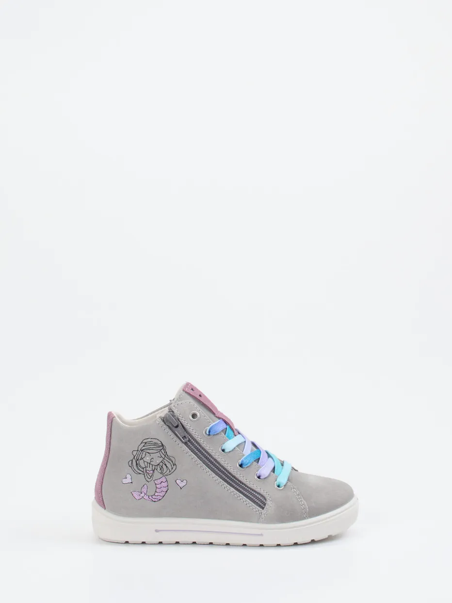 Verspielter Look für kleine Entdecker.Ricosta präsentiert einen High-Top-Sneaker für Kinder mit durchdachter Funktion und charmantem Design. Ideal für aktive Tage im Kindergarten oder beim Spielen im Freien: Das Modell besteht aus samtigem Veloursleder in dezentem Hellgrau, ergänzt durch ein atmungsaktives Microfaserfutter. Bunte Schnürsenkel, eine niedliche Meerjungfrau-Stickerei und ein seitlicher Reißverschluss setzen kindgerechte Akzente. Die flexible PU-Sohle mit Sternprofil sorgt für Rutschfestigkeit, während pastellfarbene Details modische Leichtigkeit ausstrahlen. Inspiriert von Streetwear-Elementen und Frühjahrs-Trends bleibt der Look dabei lässig und verspielt. Komfortabler Freizeit-Sneaker mit liebevollem Ricosta-Styling.