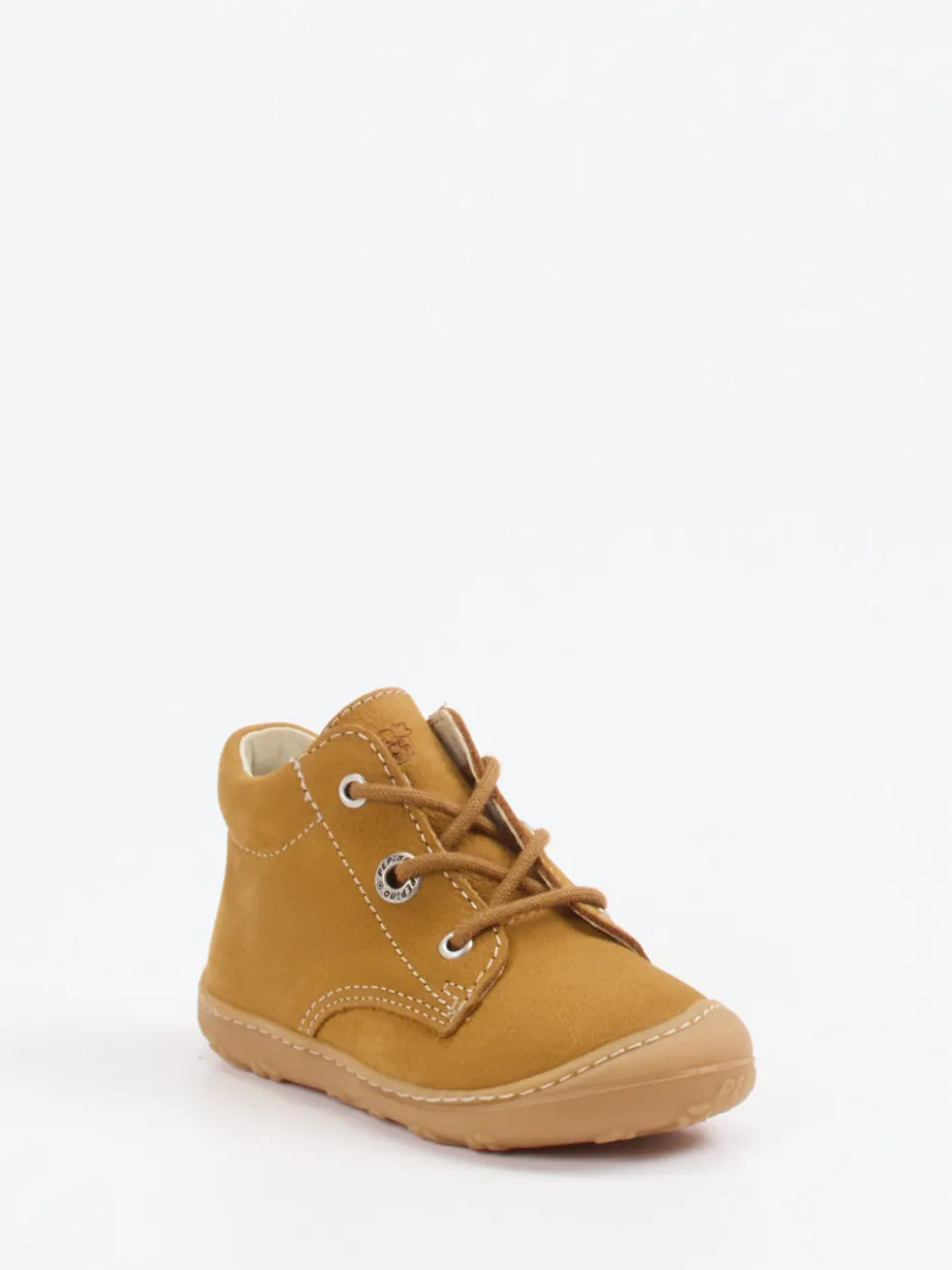 Sicher unterwegs, ganz entspannt.Ricosta präsentiert mit diesem honigbraunen Lauflerner der Linie Pepino einen durchdachten Kinderschuh in mittlerer Weite. Für kleine Entdecker im Alltag bietet das Modell weiches, samtig angeschliffenes Nubukleder, ein helles Lederfutter sowie eine komfortabel gepolsterte Innensohle. Der knöchelhohe Schnitt mit gepolstertem Einstieg schützt sanft und gibt Halt, während die flexible Naturgummisohle mit Krabbelschutz sich jeder Bewegung anpasst. Kontrastnähte, ein geprägtes Logo und eine stabile Schnürung mit Metallösen unterstreichen den charmant-skandinavischen Minimalismus des Designs. Gut kombinierbar mit Strick und Erdtönen. Ideal abgestimmt auf die Bedürfnisse kleiner Füße – mit Liebe zum Detail von Ricosta.
