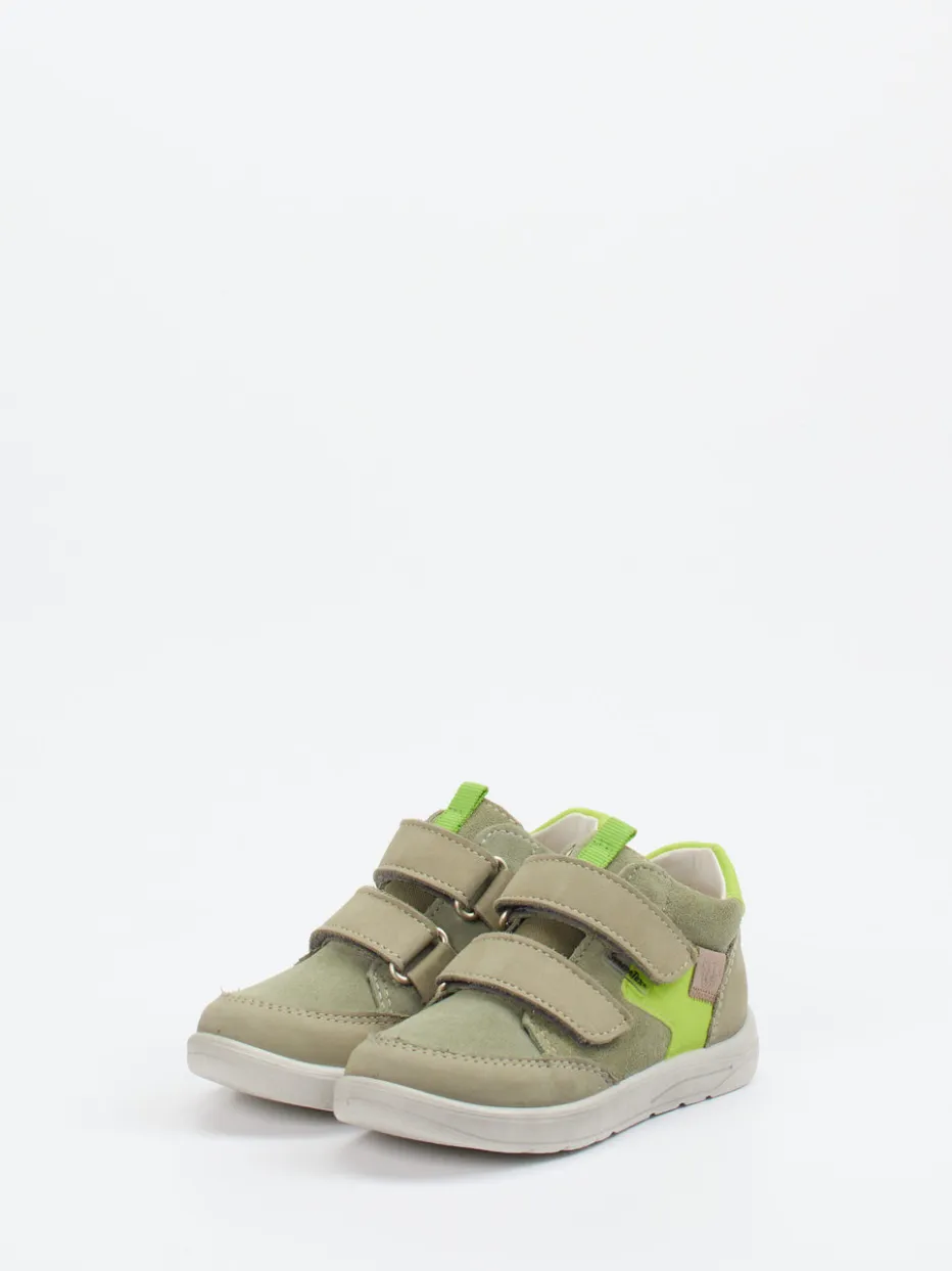 Für erste Ausflüge auf den Spielplatz schafft dieser rund geformte, knöchelhohe Alltagsschuh mit seinem weiten Schnitt und dem gepolsterten Fersenbereich besten Halt. Das olivbeige Veloursleder ist samtig angeschliffen und wird durch neongrüne Details lebendig strukturiert. Die praktische Doppel-Klett-Lösung erleichtert das An- und Ausziehen, während die rutschfeste, flexible PU-Sohle einen sicheren Tritt fördert. Tonige Nähte, weißes Innenfutter und ein dezentes Markenlogo runden das minimalistisch inspirierte Design ab. Gut kombinierbar mit sportiver Freizeitkleidung in Naturtönen oder knalligen Farben.