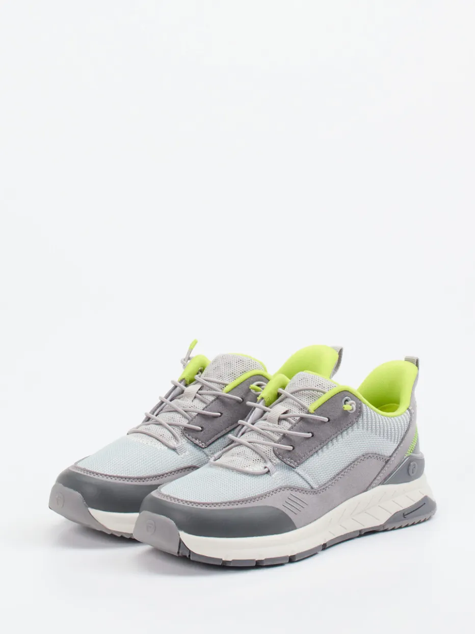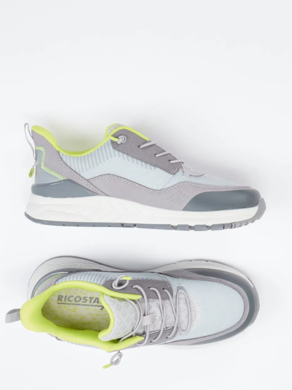 Stil trifft Bewegungsfreiheit.Ricosta präsentiert einen modernen Kinder-Sneaker für Alltag und Abenteuer. Ob Schulweg, Freizeitsport oder Spielplatz – dieser Low-Top Sneaker wurde für Bewegung entworfen. Das Obermaterial aus grauem Veloursleder erhält durch atmungsaktives Mesh eine leichte, sportliche Note. Limettengrüne Akzente, farbige Kontrastnähte und eine dynamische Zweifarbsohle sorgen für ein lebendiges Design. Die profilierte Gummisohle bietet Grip auf jedem Untergrund, das weiche Innenfutter in Neon sorgt für Tragekomfort. Inspiriert vom Streetwear-Look der Saison, ideal für junge Trendsetter. Maximaler Komfort im sportlich-funktionalen Design von Ricosta.