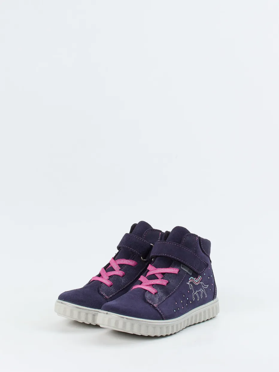 Alltagserprobt und märchenhaft verspielt.Ricosta präsentiert einen knöchelhohen Sneaker für Kinder. Ideal für Freizeit und Kita bietet der Mid-Cut-Sneaker sicheren Halt und einfaches Anziehen dank Reißverschluss und Klettverschluss. Weiches Veloursleder mit samtiger Textur trifft auf ein dunkles Violett, das durch pinke Glitzerelemente und kontrastierende Nähte akzentuiert wird. Die seitliche Einhorn-Stickerei unterstreicht den verspielten Look. Das wärmende Fleecefutter garantiert behaglichen Tragekomfort, die profilierte PU-Sohle sorgt für Rutschfestigkeit. Inspiriert von aktuellen Kidswear-Trends ist der Schuh besonders für komfortbewusste Mädchen konzipiert. Ricosta vereint liebevolles Design mit funktionalem Komfort für den Kinderalltag.