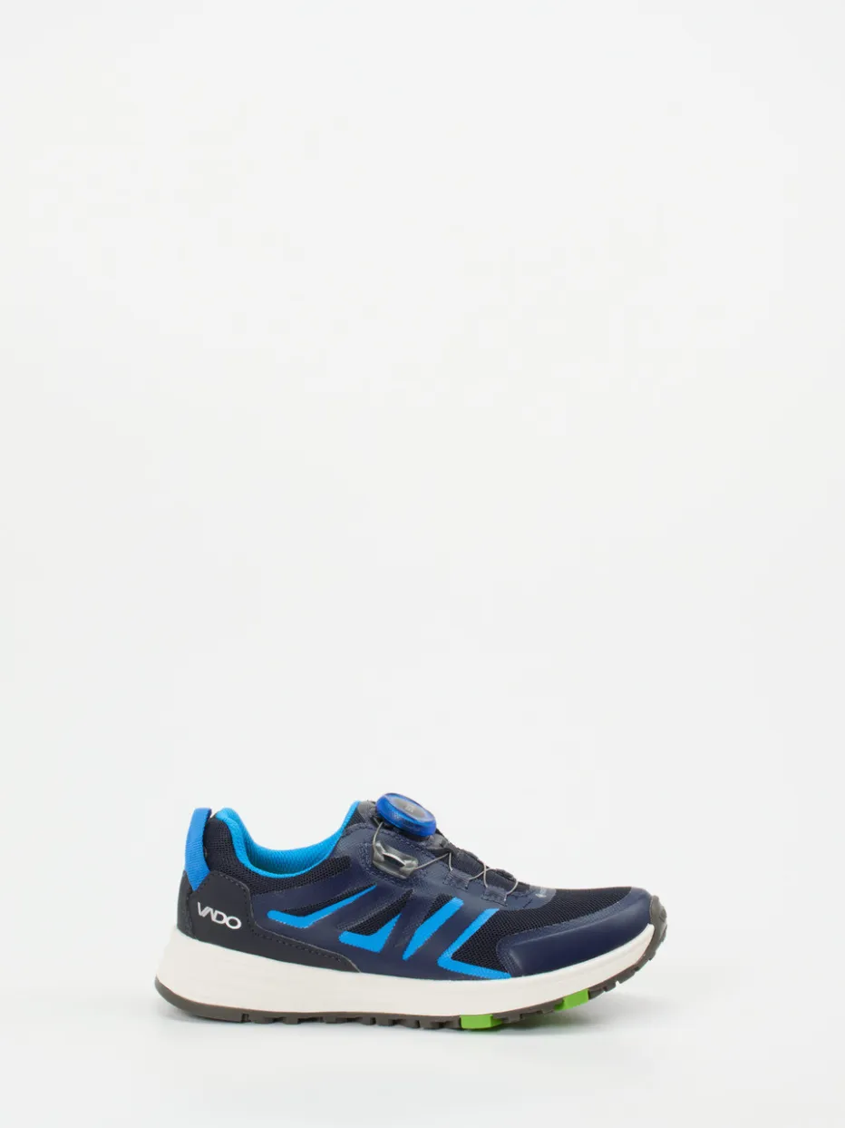 Perfekt für Abenteuer im Alltag.Vado zeigt mit diesem Kinder-Sneaker eine gelungene Kombination aus Komfort, Funktion und Design. Beim Spielen im Freien oder auf dem Schulweg sorgt das atmungsaktive, wasserabweisende Meshtextil in Dunkelblau für optimalen Tragekomfort. Leuchtblaue und neongrüne Akzente setzen sportliche Highlights, während der integrierte BOA-Drehverschluss das An- und Ausziehen erleichtert. Die profilierte Gummisohle mit Flex-Zone bietet sicheren Halt auf wechselndem Untergrund. Reflektierende Elemente steigern zusätzlich die Sichtbarkeit. Stilistisch bewegt sich das Modell im Technowear-Trend der Performance Kidswear. Robustes Design trifft auf kindgerechte Funktion – typisch Vado.