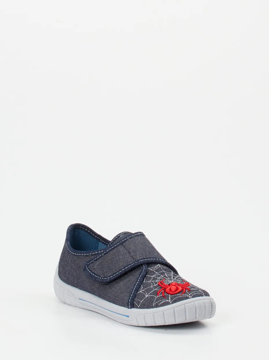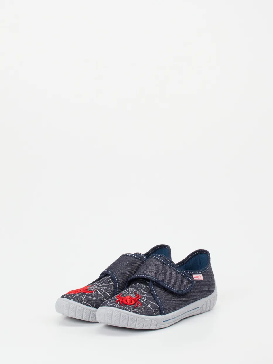 Ob beim Spielen auf glatten Böden oder beim Entspannen nach dem Kindergarten: Das dunkelblaue Textilmaterial in Jeansoptik ist strapazierfähig und matt strukturiert. Die auffällige Motivstickerei mit roter Spinne und Netz zieht Blicke an, weiße Kontrastnähte akzentuieren das klassische Design. Der praktische Klettverschluss erleichtert den Einstieg, während die flexible Gummisohle mit Anti-Rutsch-Profil sicheren Halt bietet. Inspiriert von Comic-Motiven passt der Hausschuh besonders gut zu jungen, expressiven Kinder-Styles.