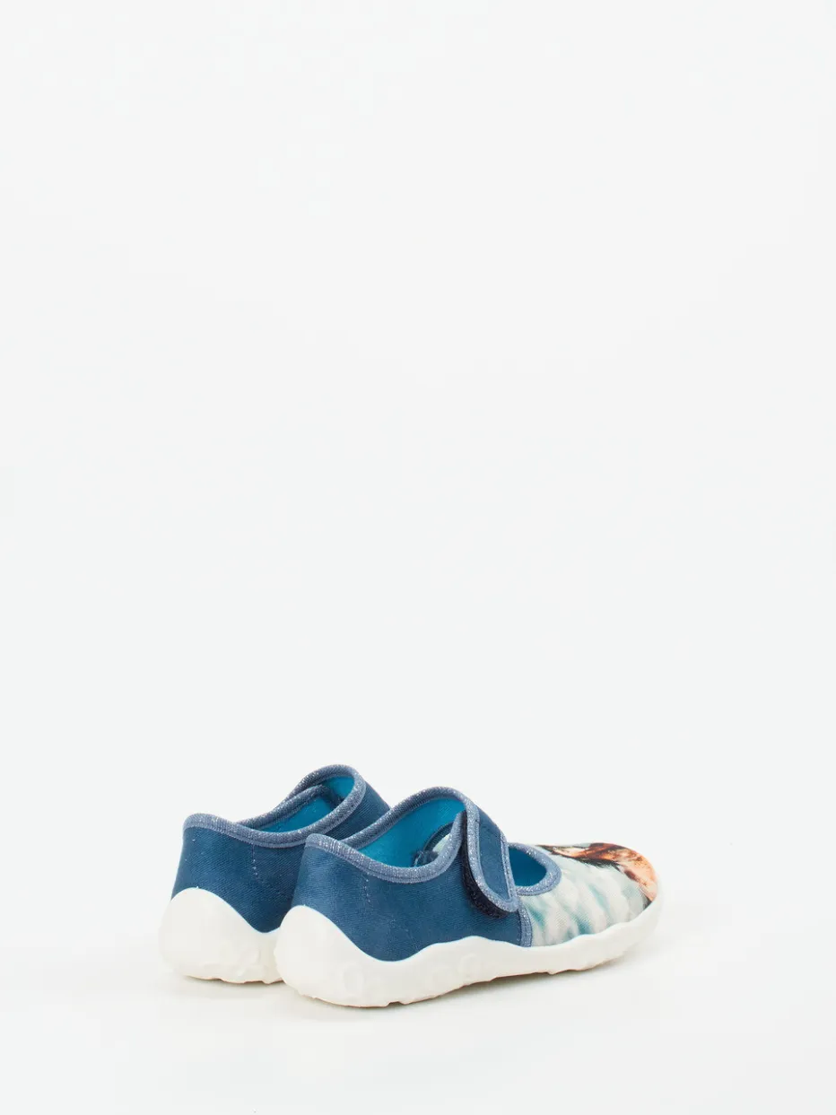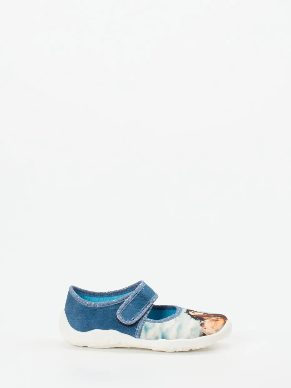 Für bewegungsreiche Nachmittage im Kinderzimmer oder entspannte Stunden im Kindergarten bietet der Schuh durch das weiche Textilmaterial mit matter Oberfläche und fotorealistischem Pferdemotiv hohen Tragekomfort. In Jeansblau gehalten, zeigen sich dazu weiße und braune Akzente sowie eine silberfarbene Glitzereinfassung entlang des Rands. Die flexible Gummisohle mit Blumenprofil unterstützt sicheres Laufen. Der Klettverschluss sorgt für ein einfaches Handling im Alltag. Perfekt kombinierbar zu Leggings oder bequemen Baumwollhosen.