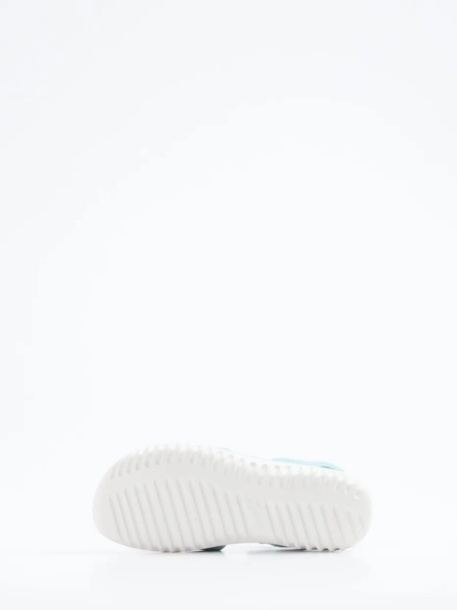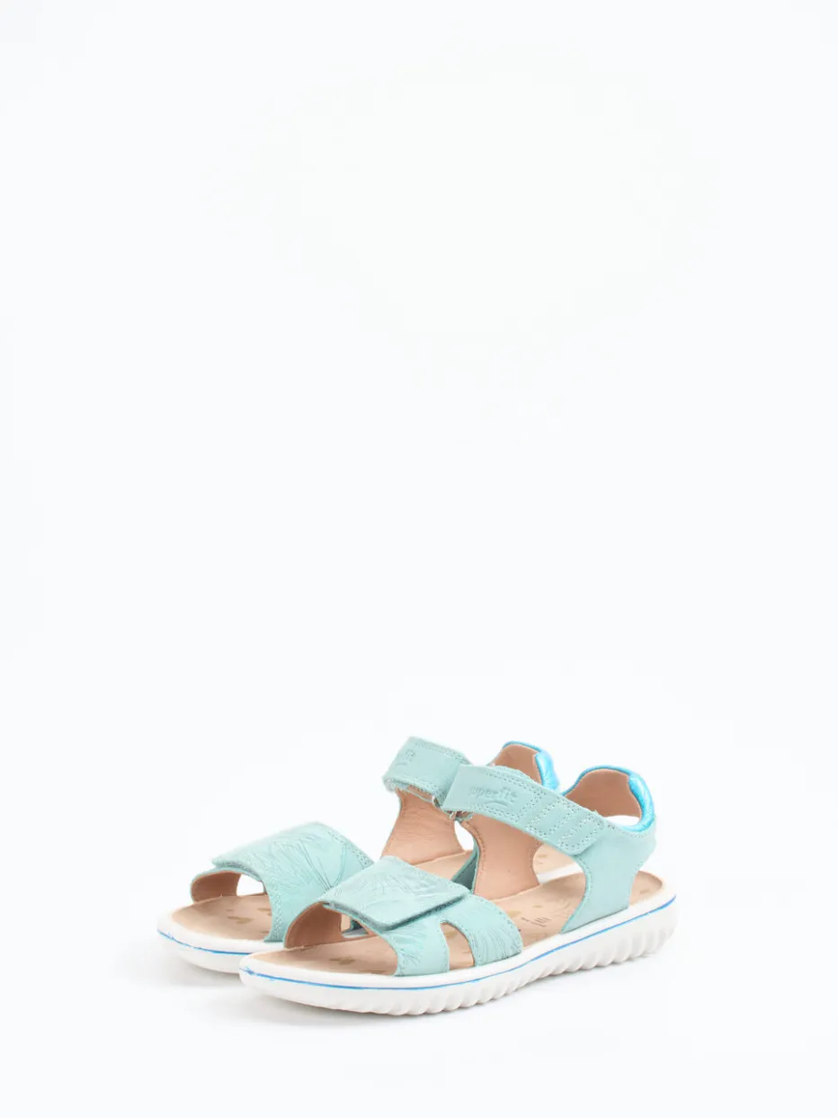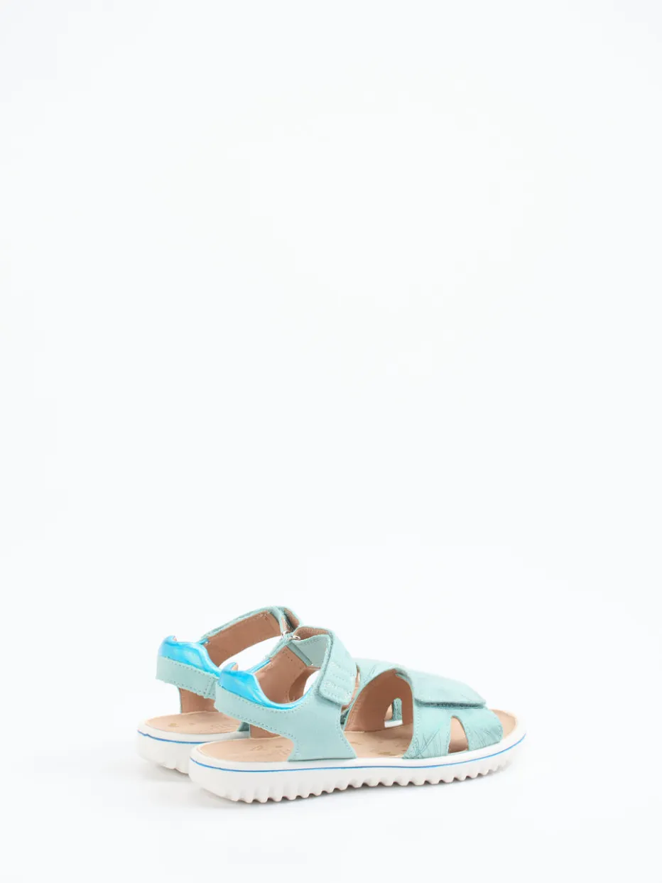 Diese Klettsandale vereint geprägtes Leder mit ergonomischer Form und mintgrüner Farbgebung – funktional und stilgerecht für warme Tage.