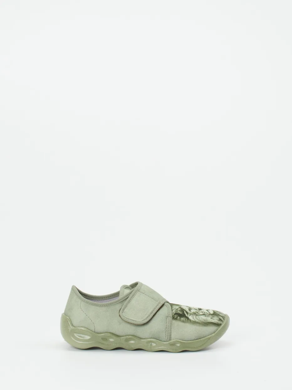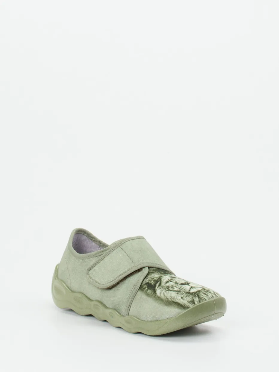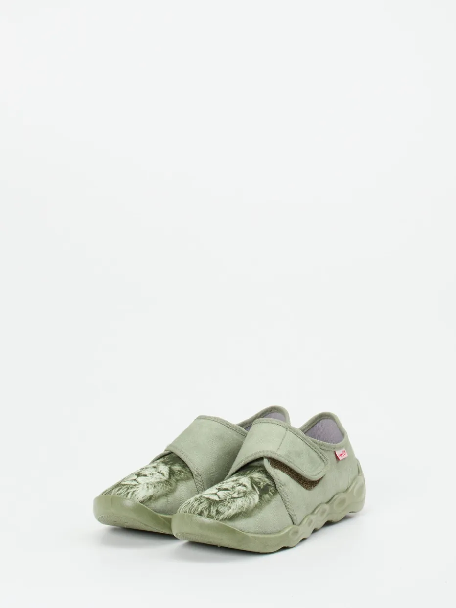 Leichter Kinderhausschuh mit praktischem Klettverschluss, rutschfester Sohle und auffälligem Löwenmotiv – funktional und verspielt zugleich.
