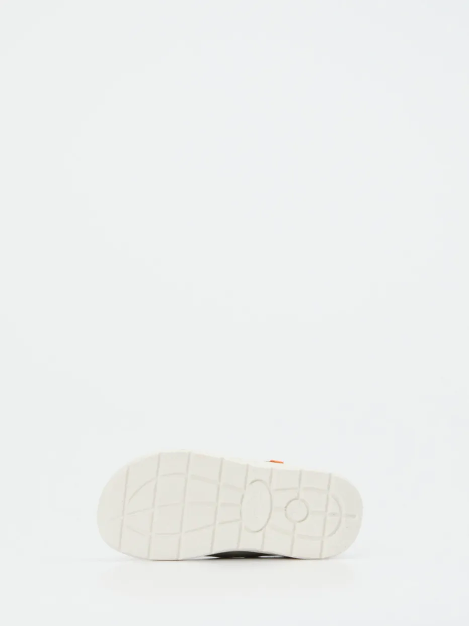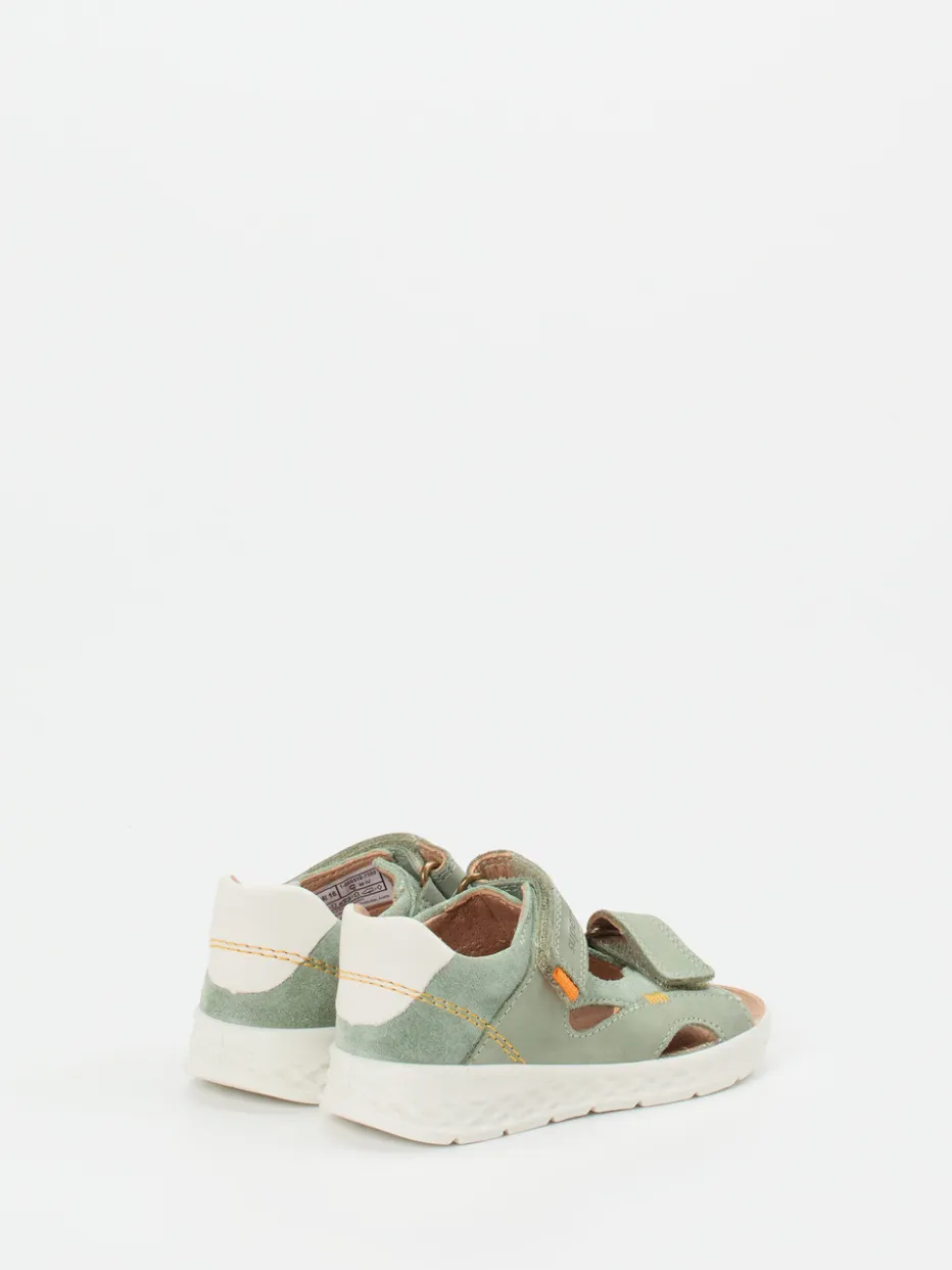 Ob bei einem Ausflug in die Natur oder auf dem Spielplatz – das weiche Nubukleder mit samtiger Velourslederstruktur, kombiniert mit luftdurchlässigem Lederfutter, bietet ein angenehmes Tragegefühl. Optisch dominiert ein frisches Salbeigrün mit kontrastreichen, gelben Ziernähten und offwhitefarbenem Fersenpatch. Die geschlossene Form mit Cut-Outs und praktischen Klettverschlüssen erleichtert das An- und Ausziehen. Eine flexible PU-Sohle mit rutschhemmendem Profil macht die Sandale outdoorfähig und sicher. Beste Kombinationspartner sind kurze Hosen und leichte Outdoorjacken.