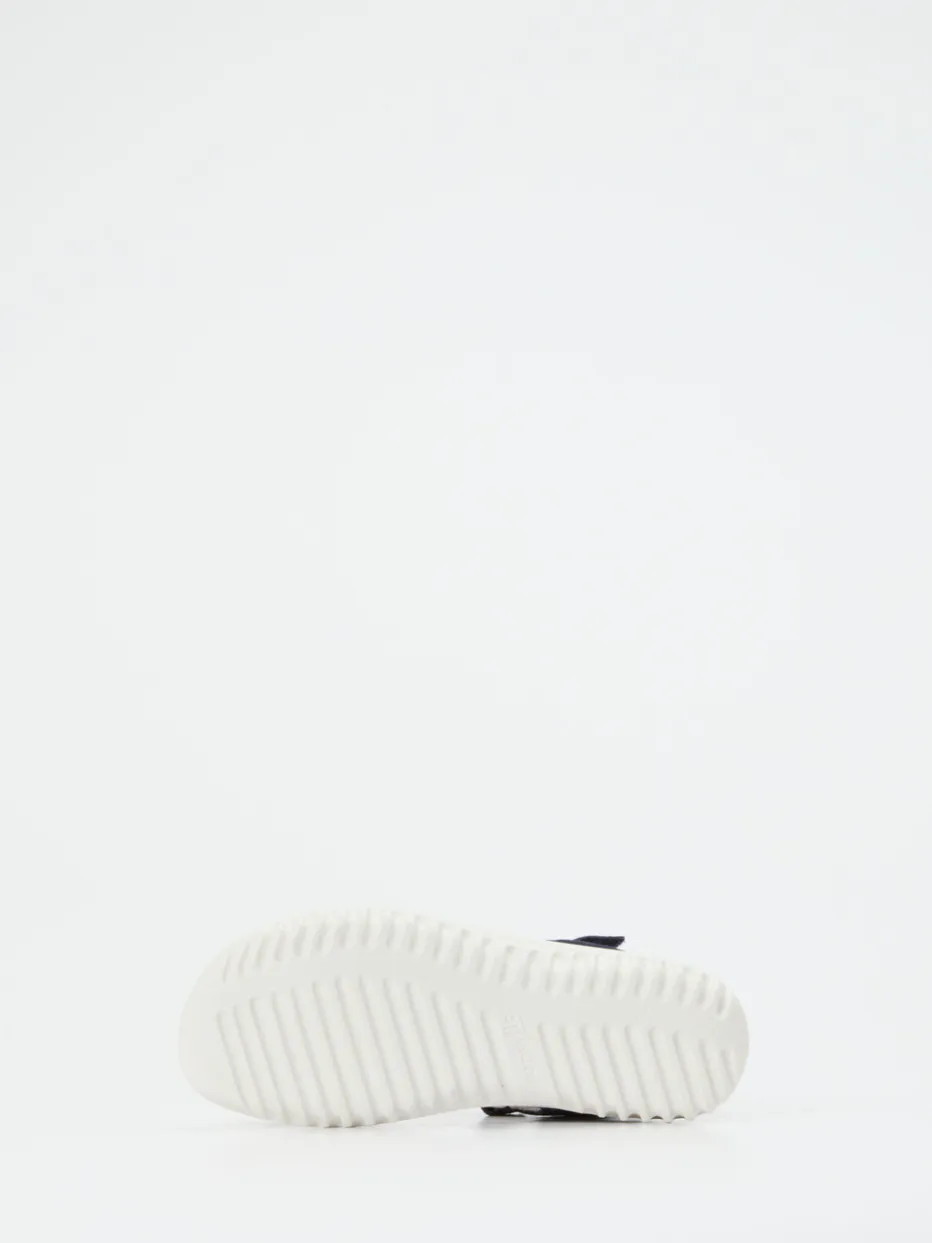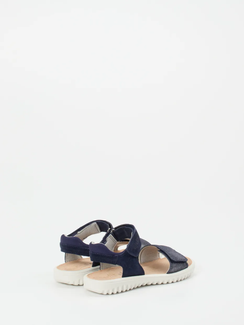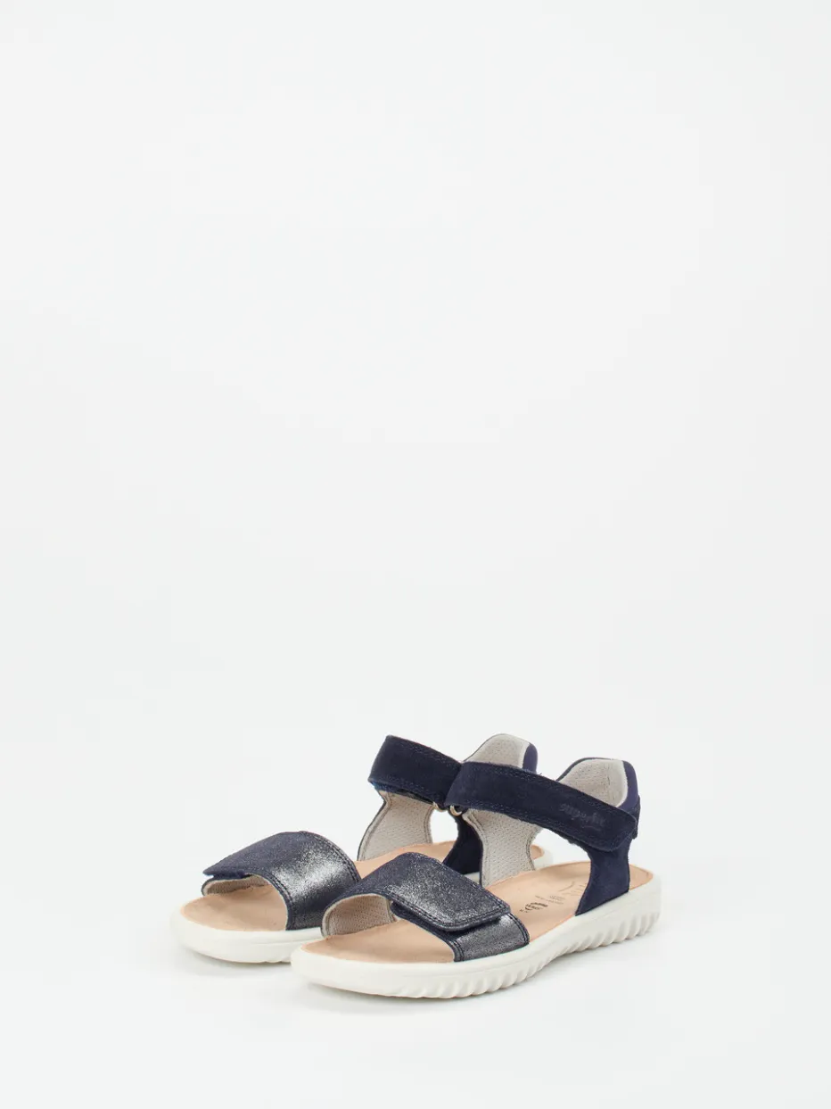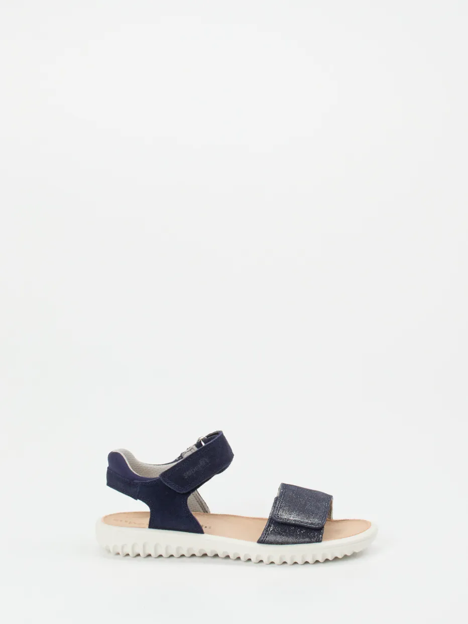 Strapazierfähig und stilvoll zugleich.Superfit präsentiert eine moderne Klettsandale für Kinder. Ideal für aktive Tage im Freien: Das Obermaterial besteht aus geprägtem Veloursleder in Dunkelblau mit leicht glänzendem Metallic-Finish an Vorder- und Fersenriemen. Asymmetrische Riemenführung, gepolsterte Innensohle mit Lederbezug und ein effektiver Klettverschluss erhöhen den Tragekomfort. Die flache, weiße PU-Sohle bietet dank tiefem Profil sicheren Halt auf verschiedenen Untergründen. Die minimalistisch inspirierte Form kombiniert Komfort mit subtilem Trendbewusstsein. Ein funktionaler Sommerschuh mit superfit-typischem Komfortanspruch.