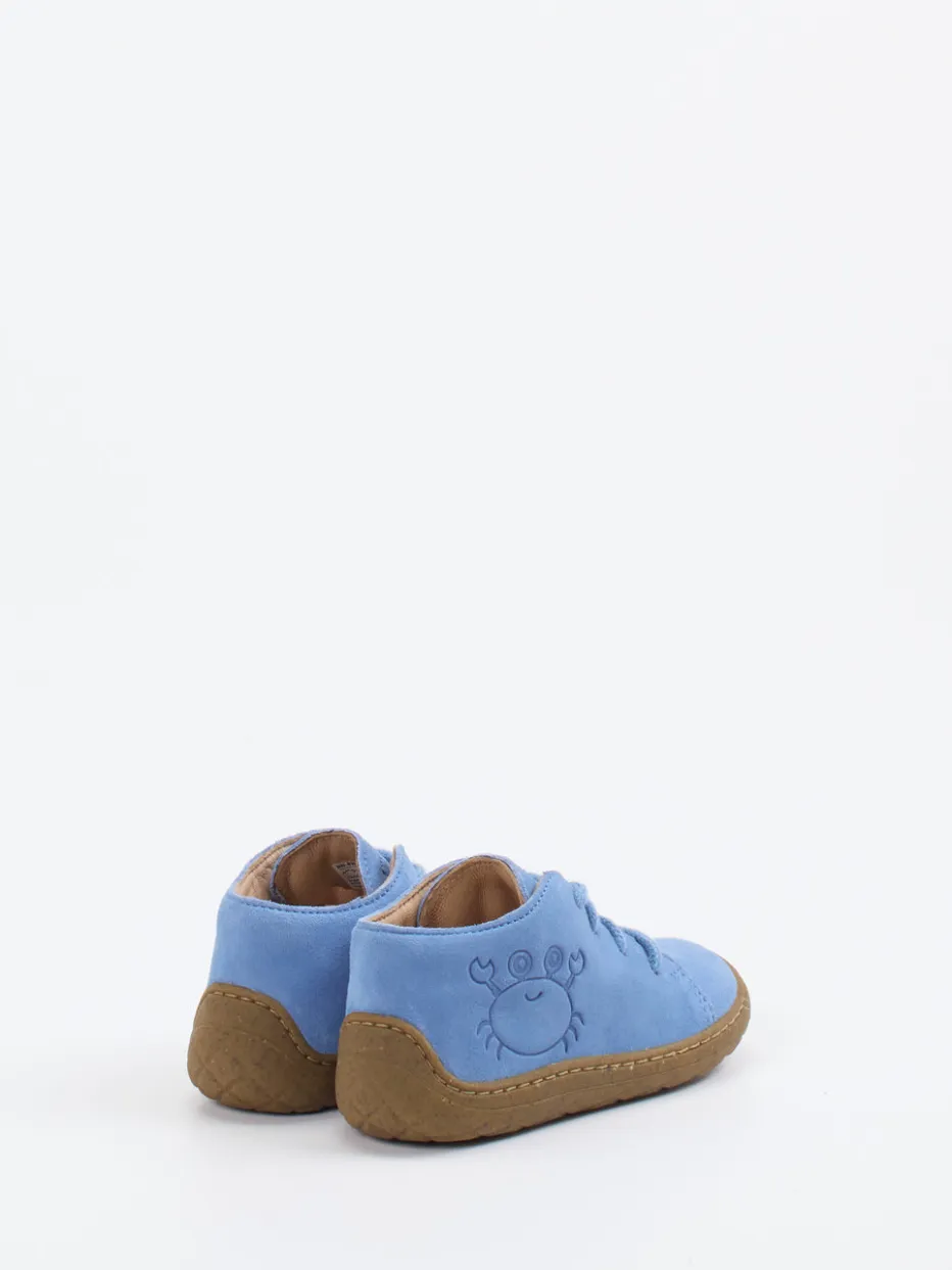 Dieser kindgerechte Lauflernschuh aus weichem Veloursleder kombiniert ergonomische Passform mit liebevollen Details wie dem Krabbenmotiv und der Ton-in-Ton-Naht.