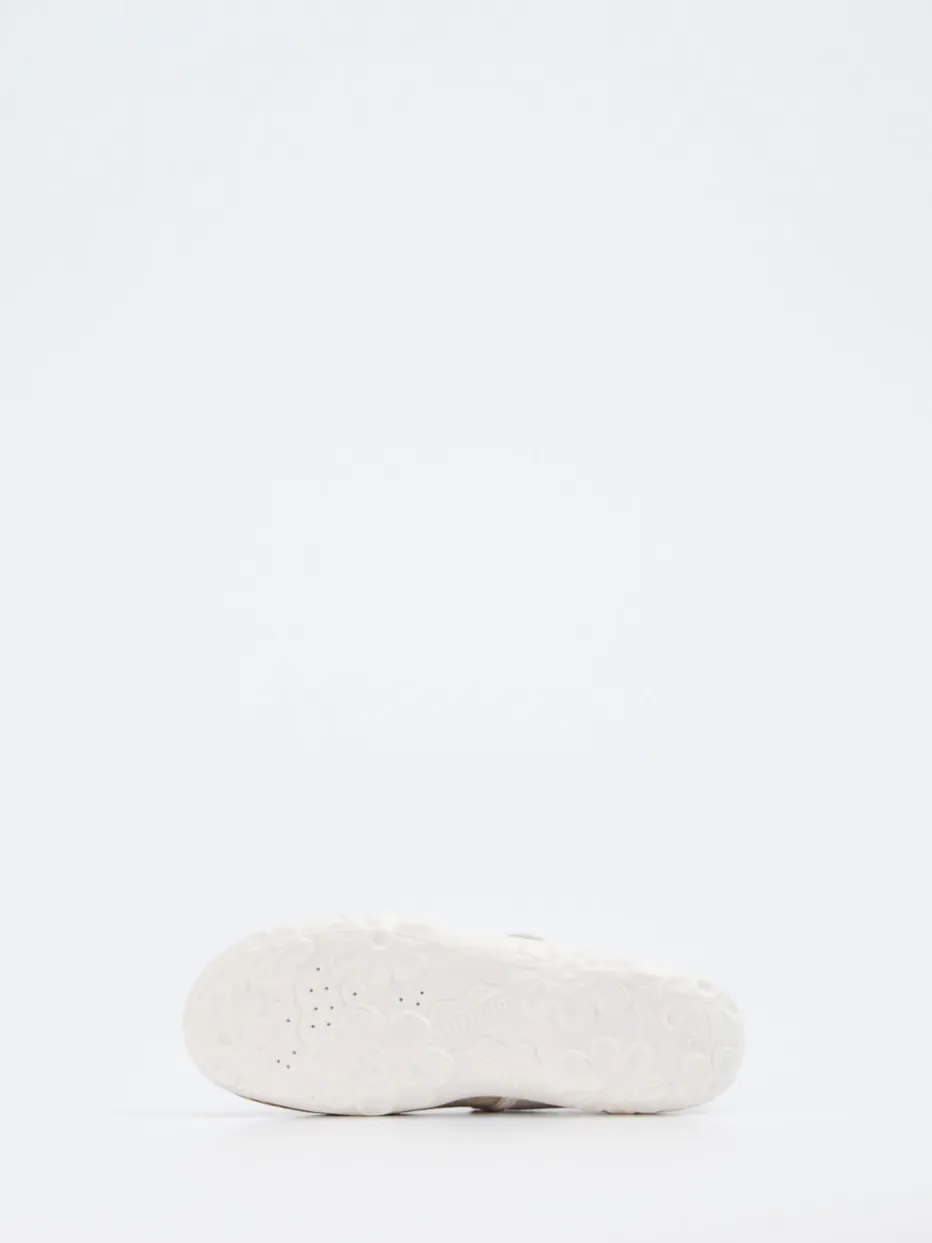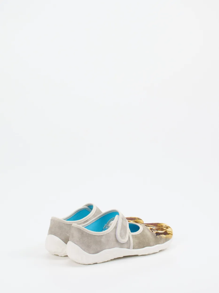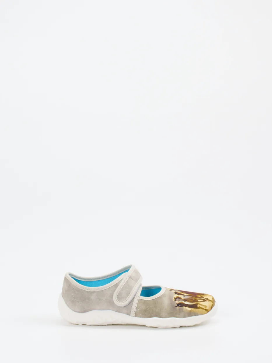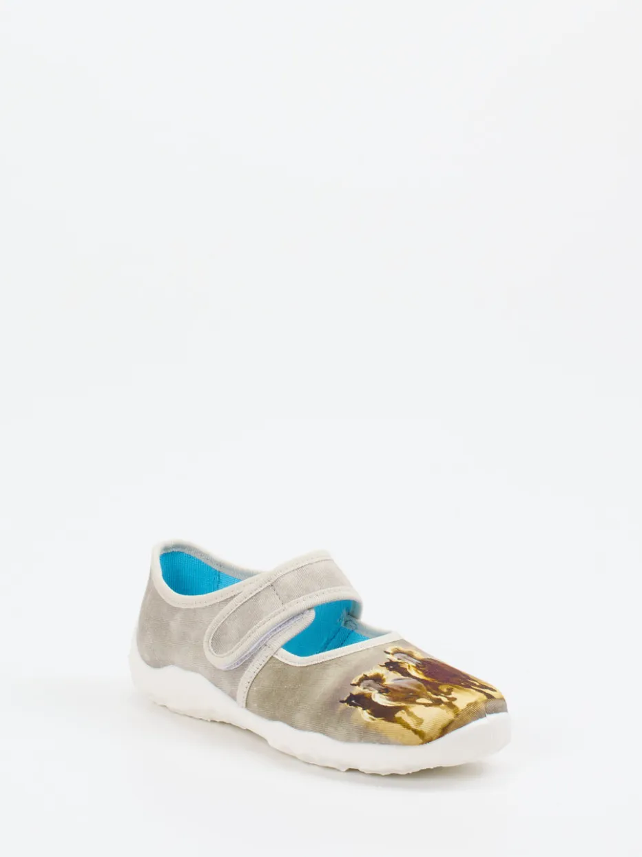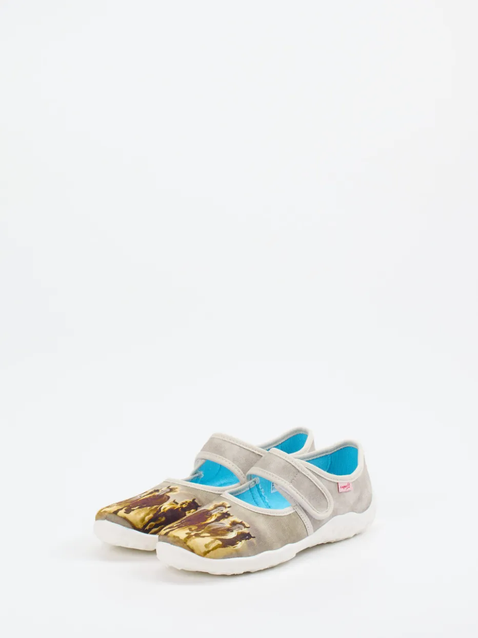Galoppierender Charme für kleine Pferdefans.Superfit präsentiert mit diesem Mary Jane einen liebevoll gestalteten Kletthausschuh für Kinder. Ideal für Zuhause oder entspannte Freizeitmomente: Das hellgraue Textil mit mattierter Oberfläche ist mit einem fotorealistischen Pferdemotiv auf dem Vorderfuß bedruckt – ein Hingucker im Kinderzimmer wie auch unterwegs. Der praktische Klettverschluss erleichtert das An- und Ausziehen, während die flexible PU-Sohle mit floraler Struktur sicheren Halt bietet. Innen sorgt ein kräftig hellblaues Futter für zusätzlichen Tragekomfort. Als Teil des Trends „Statement-Prints SS24“ steht der Schuh für individuellen Stil. Superfit vereint kindliches Design mit funktionaler Alltagstauglichkeit.