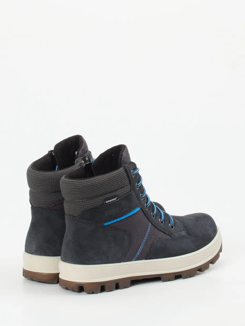 Perfekt für kleine Entdecker.Superfit präsentiert mit diesen Outdoor-Boots ein Modell für aktive Kinder. Ob auf dem Schulweg oder bei Abenteuern im Wald – das wasserabweisende Veloursleder mit matter Oberfläche bietet Schutz und Widerstandsfähigkeit. Die graue Farbgebung wird durch kobaltblaue Kontrastnähte und zweifarbige Schnürsenkel aufgelockert. Ein seitlicher Reißverschluss sorgt für einfaches An- und Ausziehen, während der gepolsterte Schaft und die PU-Profilsohle sicheren Halt garantieren. Inspiriert von Gorpcore und Utility-Trends eignet sich der Schuh für Freizeit und Outdoor gleichermaßen. Kombiniert mit einer Thermojacke entsteht ein runder Look für kalte Tage. Halt, Schutz und Komfort: kindgerecht umgesetzt von Superfit.