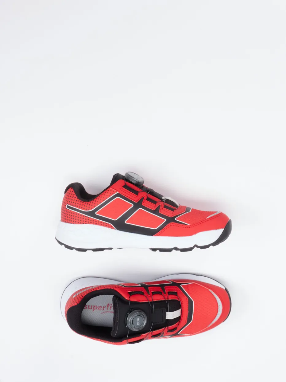 Ideal für Spielplatz, Schulhof oder Sportkurs: Das atmungsaktive Textilmaterial mit leicht matter Mesh-Struktur sorgt für ein angenehmes Tragegefühl. Die griffige Gummisohle bietet sicheren Halt, während reflektierende Elemente für zusätzliche Sichtbarkeit sorgen. Die sportlich-klassische Silhouette in leuchtendem Signalrot wird durch schwarze und weiße Kontraste akzentuiert. Ein BOA-Drehverschluss ermöglicht einfaches, kindgerechtes An- und Ausziehen. Das Modell verbindet Performance-Charakter mit angesagter Streetwear-Optik.