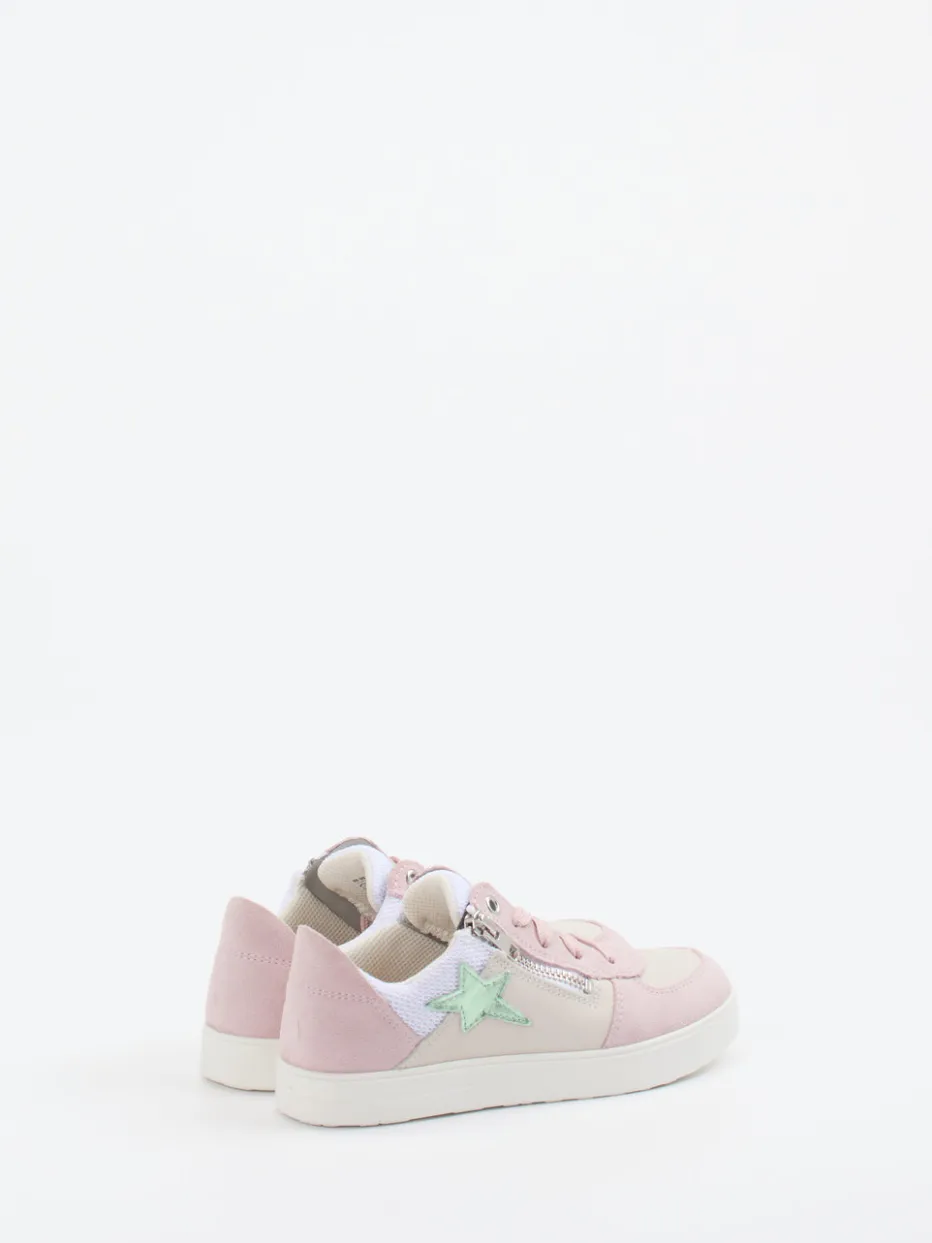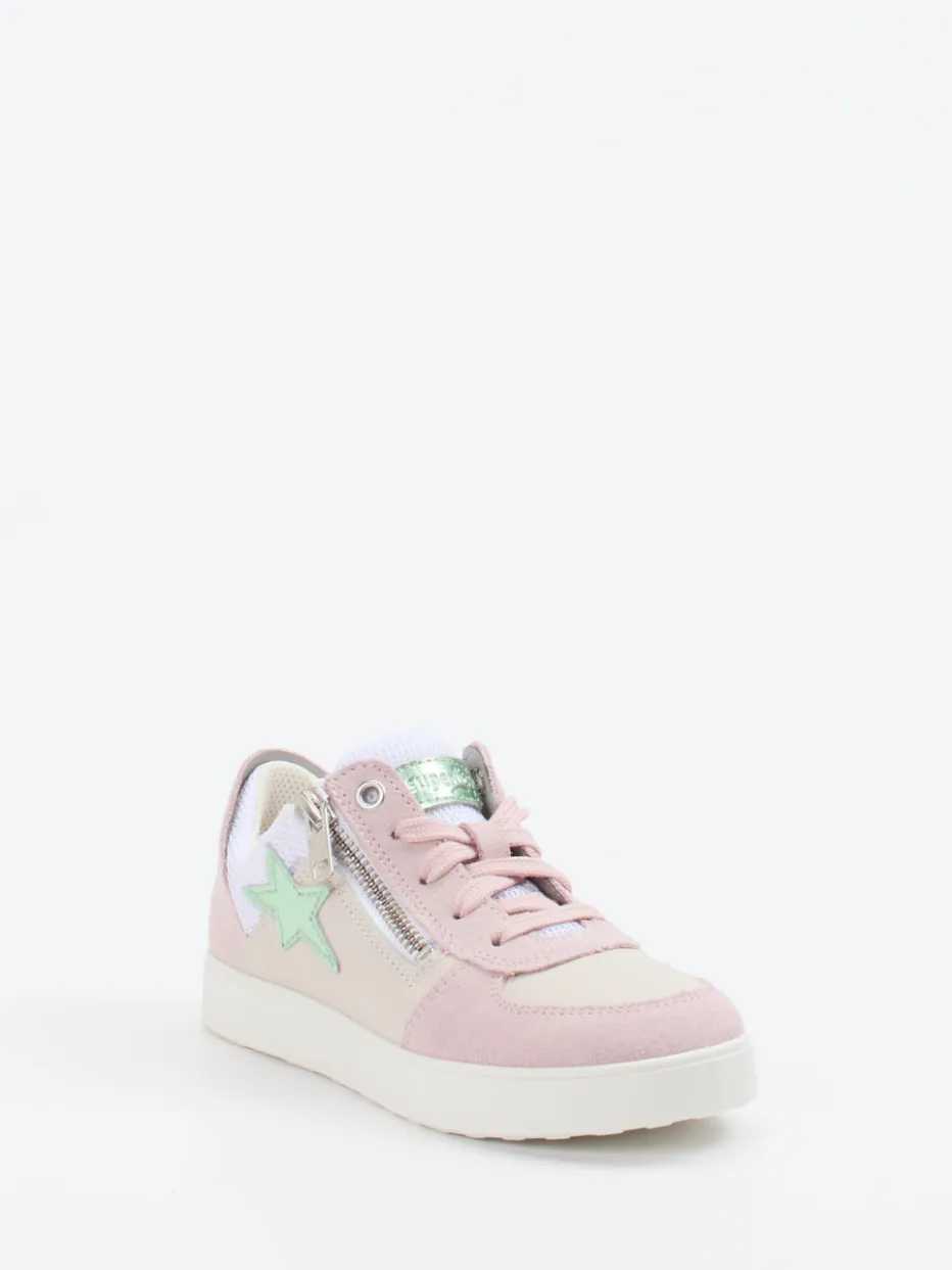 Ideal für Freizeitaktivitäten, begleitet der Schuh mit samtig angeschliffenem Veloursleder, luftigem Mesh und glattem Synthetik durch warme Frühlingstage. Das zarte Rosé wird durch Sterne in Mintgrün, einen silberfarbenen Reißverschluss und ein Metallic-Label kontrastiert. Die flache, rutschhemmende PU-Sohle bietet Komfort und Trittsicherheit beim Spielen. Klassische Schnürung plus Reißverschluss erleichtern das Anziehen, während Streetwear-Einflüsse den Look modernisieren. Kombiniert sich stilvoll mit hellen Jacken oder Rucksäcken im Sternendesign.