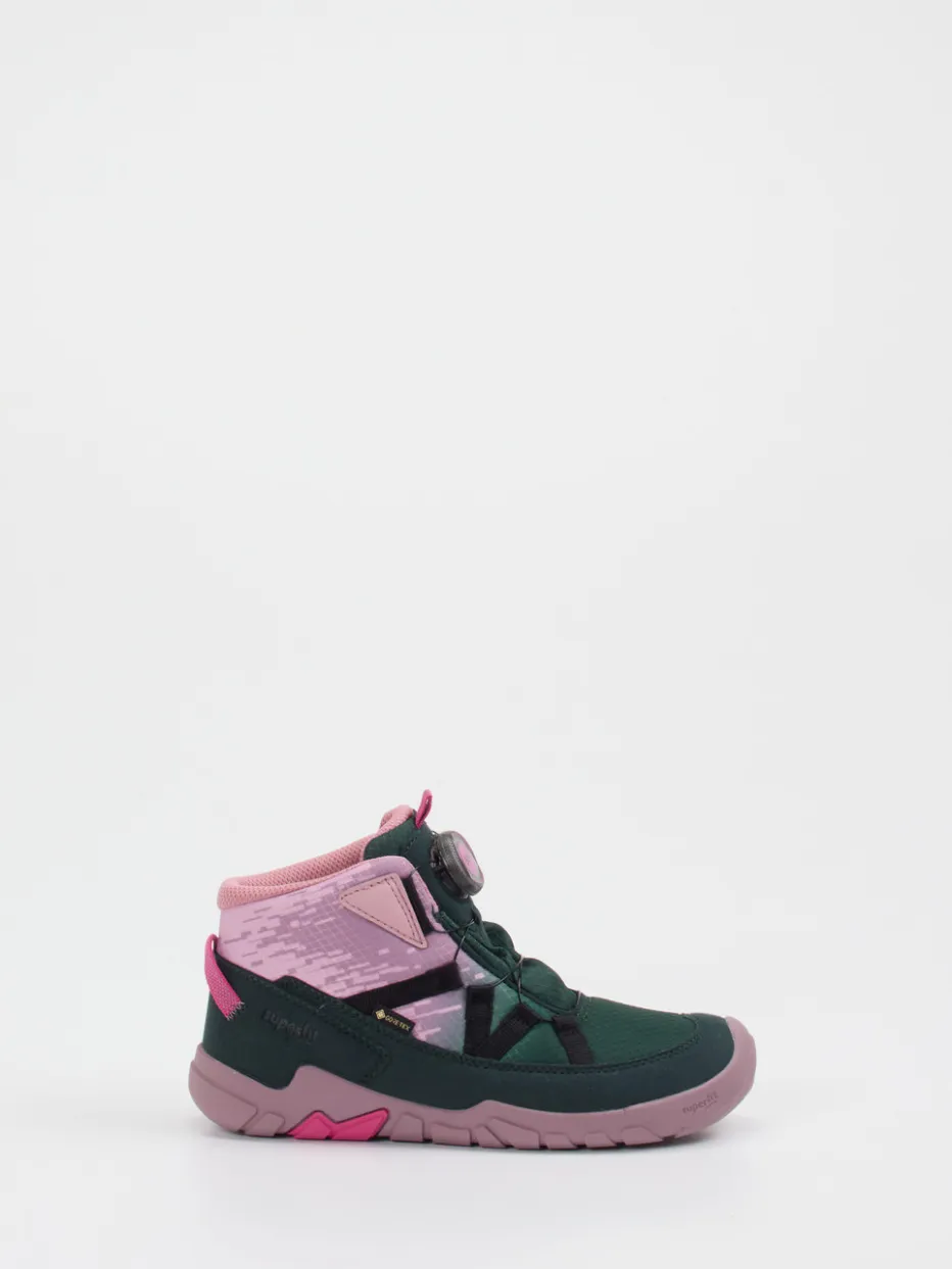 Bereit für jedes Outdoor-Abenteuer.Superfit bietet mit diesem Wanderschuh für Kinder eine sportlich-funktionale Lösung für aktive Tage. Ob beim Wanderausflug mit der Familie oder auf dem Weg zur Schule – das robuste Textil mit matter Oberfläche und digital gemustertem Colorblocking in Tannengrün, Altrosa und Pink sorgt für Langlebigkeit und markante Optik. Das BOA-Drehverschlusssystem erleichtert das An- und Ausziehen erheblich. Die farblich abgesetzten Zuglaschen und die profilierte Gummisohle mit pinken Details ergänzen das sportliche Design. Inspirieren lässt sich das Modell von Gorpcore und Techwear-Trends. Ein durchdachter Begleiter für junge Entdecker mit Anspruch an Komfort und Stil.