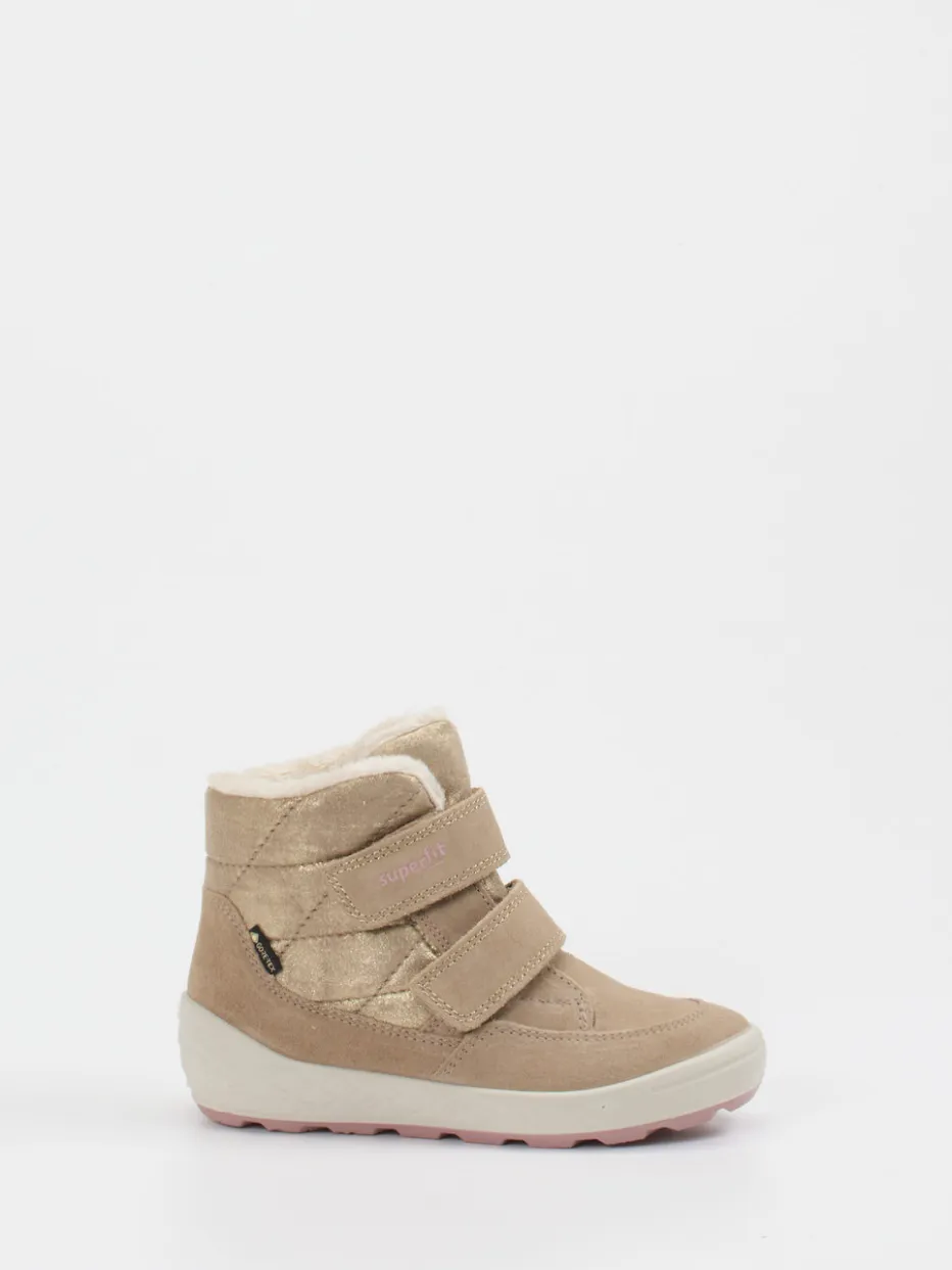 Für kleine Entdecker im Winteralltag.Superfit präsentiert mit diesen bequemen Winterboots ein funktionales Kindermodell für kalte Tage. Das beigebraune Veloursleder kombiniert mit samtig matter Oberfläche und glänzendem Metallic-Einsatz sorgt für einen modernen Scandi-Look. Dank GORE-TEX®-Membran und weichem Textilfutter bleiben Kinderfüße warm und trocken. Zwei breite Klettverschlüsse erleichtern das An- und Ausziehen, während eine rosa profilierte PU-Sohle guten Halt bei Nässe bietet. Die rosa Logo-Stickerei akzentuiert das Design auf charmante Weise. Stilistisch verbinden sich Gorpcore-Funktionalität mit dezenten Trends für Herbst/Winter. Kindgerecht durchdacht mit stilvoller Performance – typisch Superfit.