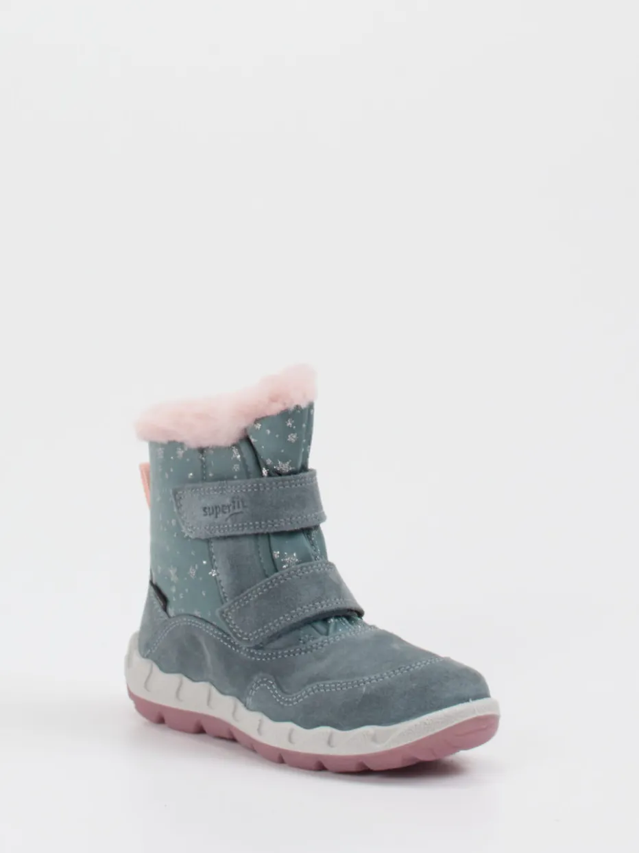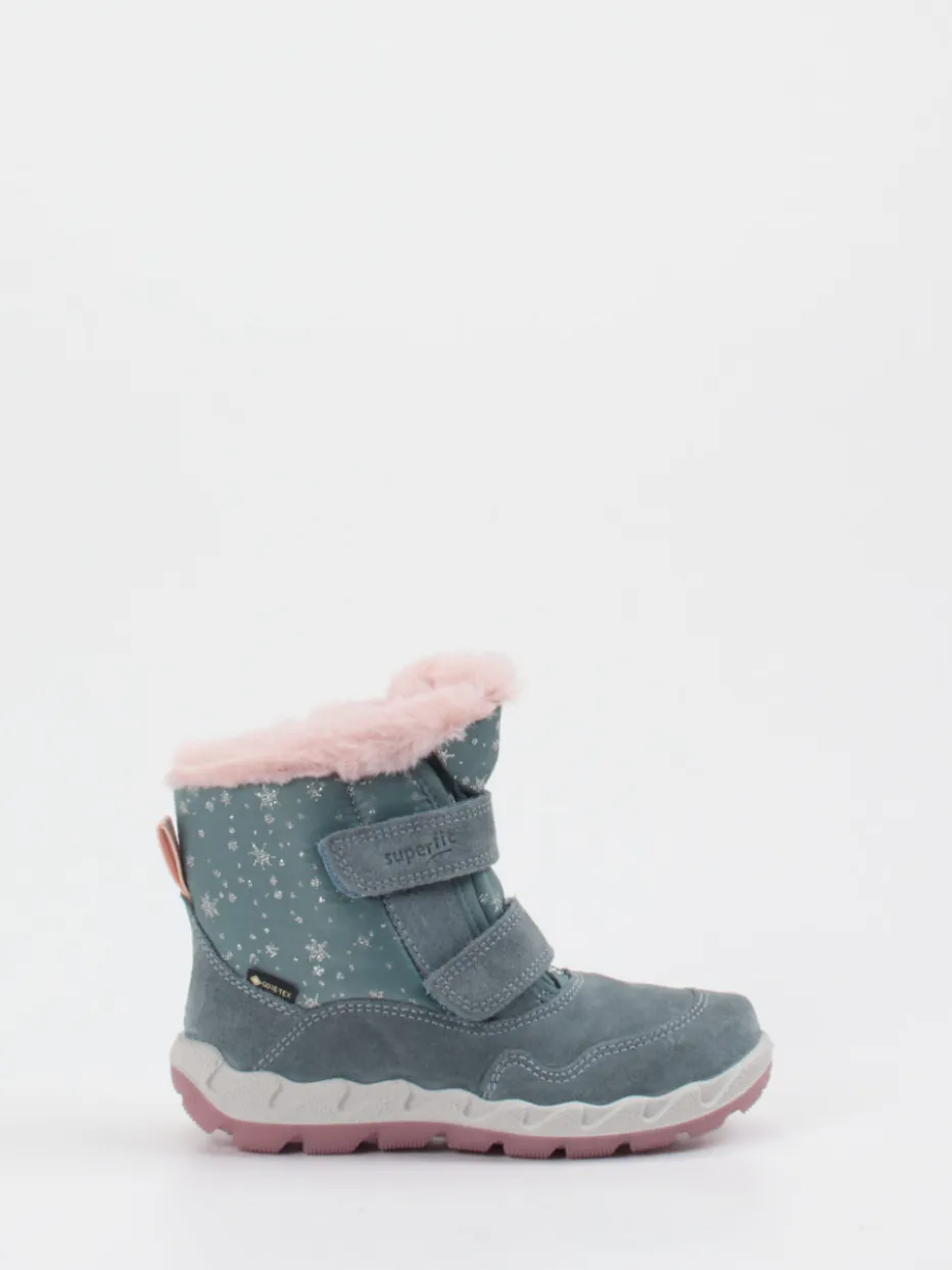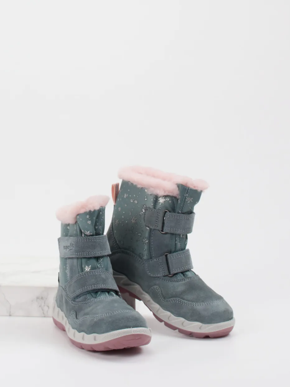 Wetterfest durch Eis und Schnee.Superfit zeigt mit diesem Winterstiefel für Kinder eine funktionale Lösung für frostige Outdoor-Abenteuer. Ein warmes rosa Kunstfellfutter, kombiniert mit wasser- und winddichtem GORE-TEX-Material und samtig angeschliffenem Veloursleder, schützt bei rauem Winterwetter. Die blaugraue Farbe harmoniert mit reflektierenden Schneeflockenprints und macht das Modell auch visuell besonders. Ein knöchelhoher Schnitt mit Klettverschluss bietet leichten Einstieg und sicheren Halt, während die rosa profilierte PU-Sohle rutschfesten Komfort gibt. Ideal für Alltag und Ausflüge – modisch im Trend „Winter Pastels“. Lässt sich gut mit Thermohose und Winterjacke stylen. Funktionalität und Design vereint – mit kindgerechter Superfit-Qualität.