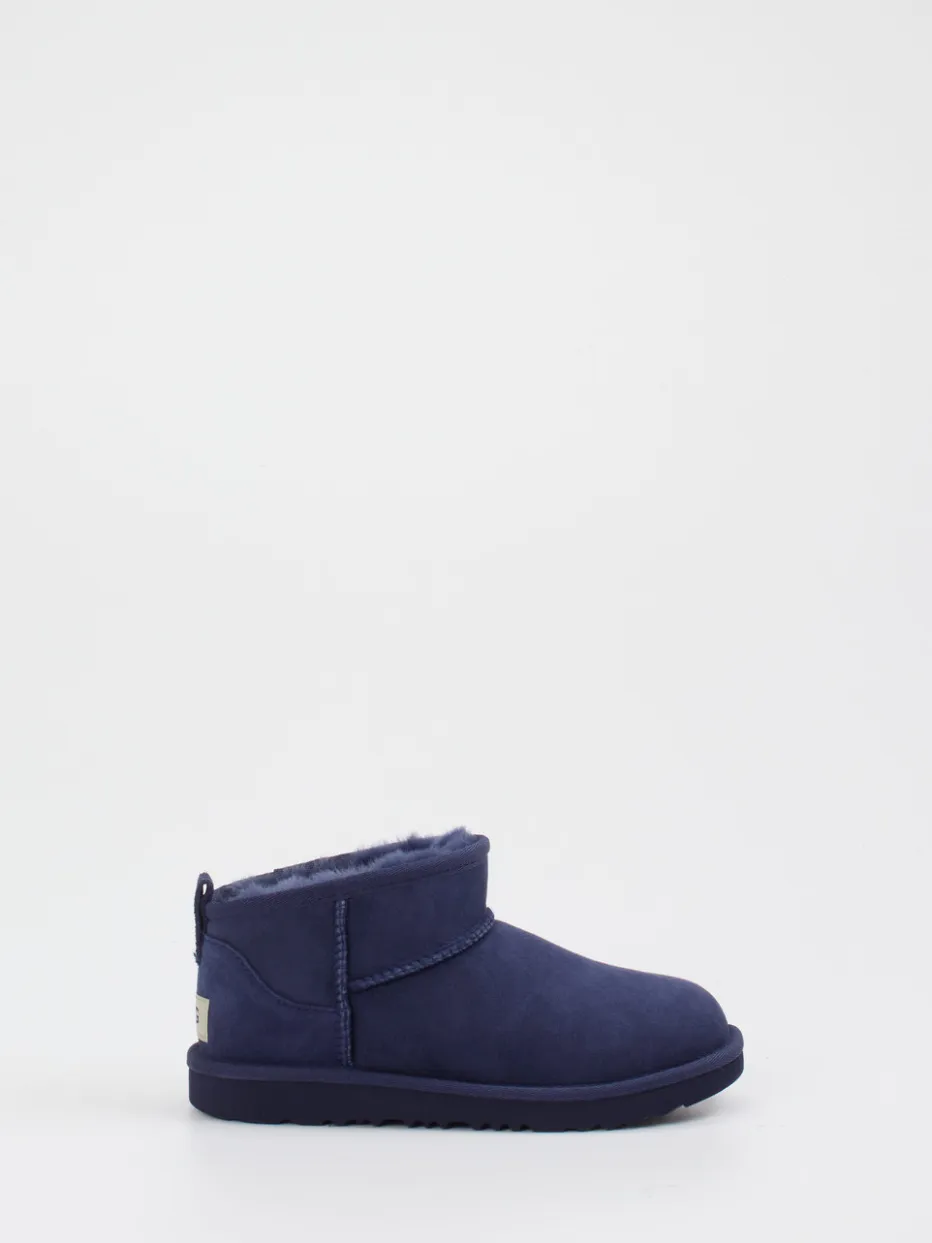 Wärme trifft auf stilvollen Minimalismus.UGG präsentiert mit diesen Lammfell-Boots ein komfortorientiertes Modell für Damen. Ob beim Relaxen daheim oder bei einem Spaziergang in der Stadt – der knöchelhohe Schnitt mit Zuglasche und gefüttertem Schaft sorgt für unkomplizierten Komfort. Das blau gefärbte Veloursleder zeigt sich in matter Optik und trifft auf echtes, wärmendes Lammfellfutter. Eine Ton-in-Ton-Nahtführung und das dezente Logo an der Ferse ergänzen das minimalistische Design. Die profilierte Gummisohle gewährleistet Rutschfestigkeit an kalten Tagen und passt zum Casualwear-Trend. Ein hochwertiger Winterbegleiter mit kultivierter Wohlfühlästhetik von UGG.