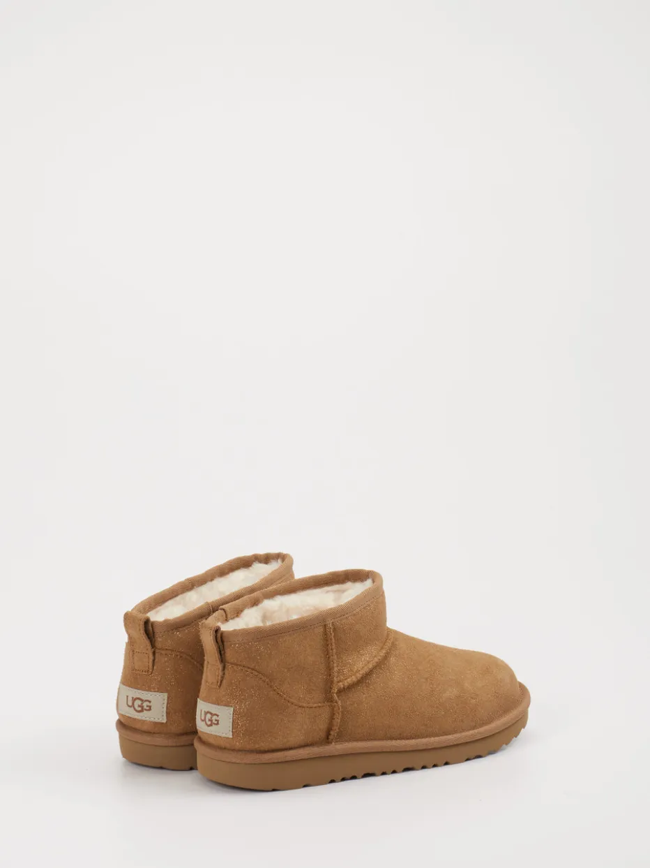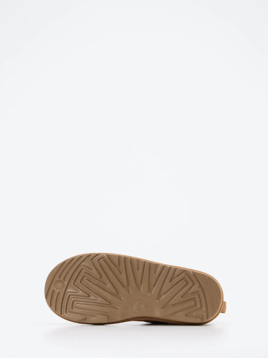 Wärmender Komfort für kühle Stunden. UGG präsentiert diese Unisex-Stiefeletten in cognacbraunem Veloursleder mit flachem Schaft. Ideal für gemütliche Alltagsmomente oder entspannte Wintertage zu Hause: Das weiche Material mit leicht genarbter Textur zeigt einen dezenten Glitzereffekt und sorgt zusammen mit dem wärmenden Textilfutter für angenehme Geborgenheit. Die runde, kompakte Silhouette mit Zuglasche hinten und schlupffreundlichem Einstieg betont den lässigen Charakter. Eine profilierte Gummisohle bietet sicheren Halt auf rutschigen Böden. Inspiriert von ruhigem Luxus und Loungewear-Trends, lassen sich die Boots bestens zu Strick, Jersey oder Casual-Looks kombinieren. Markentypischer Tragekomfort und ein feeling von „Relaxed Luxury“ inklusive.