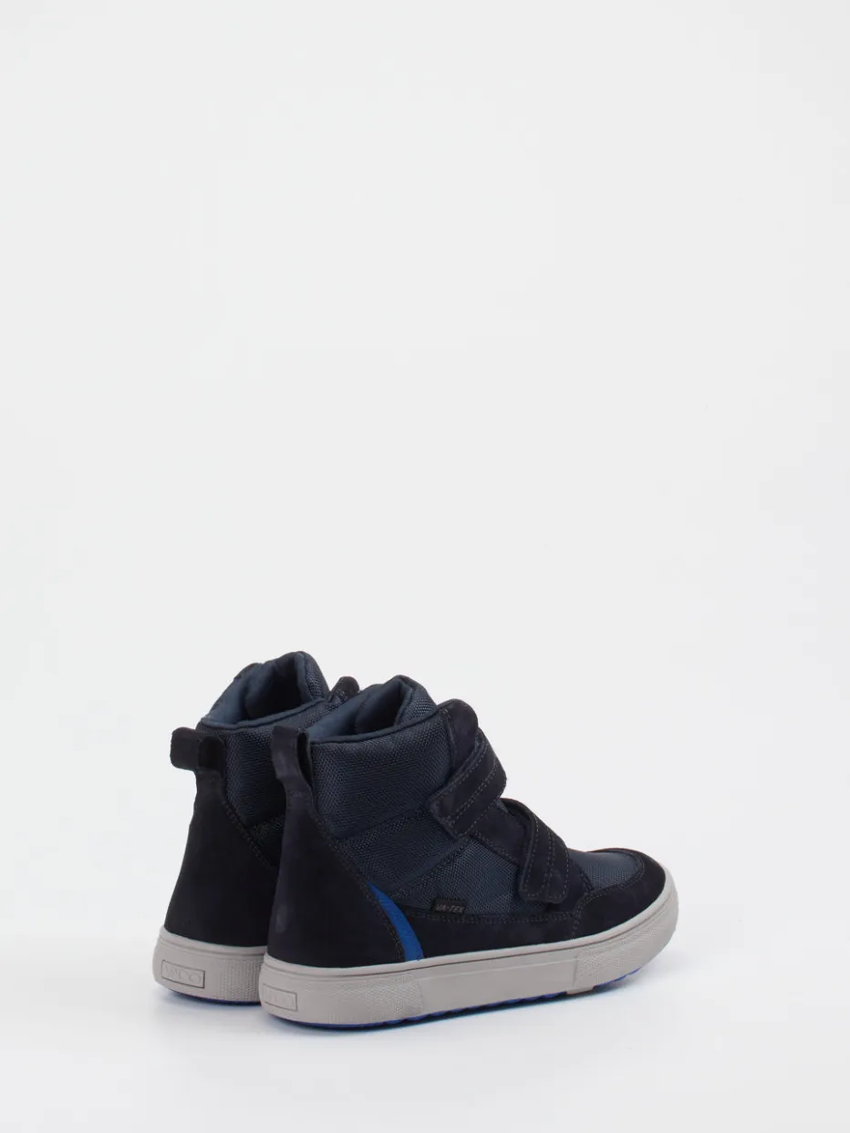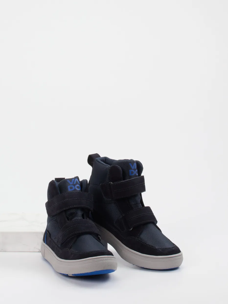 Für Bewegung gemacht.Vado liefert mit diesem High-Top-Sneaker für Kinder einen strapazierfähigen Begleiter für dynamische Tage. Ob auf dem Spielplatz oder auf Wanderwegen – dieser Schuh schützt bei jedem Wetter durch die wasserabweisende V-TEX-Membran. Das hochwertige Veloursleder zeigt sich samtig-matt und ist tonig vernäht. In sattem Dunkelblau mit kobaltblauen Akzenten gehalten, bietet das Modell eine klassische, hochgeschlossene Silhouette mit praktischem Klettverschluss und Zuglasche. Rutschfeste Flex-Zonen in der Gummisohle sorgen für sicheren Tritt. Passt perfekt zu Outdoorjacke und robuster Kinderhose. Vado vereint durchdachte Funktion mit sportlich-urbanem Design.