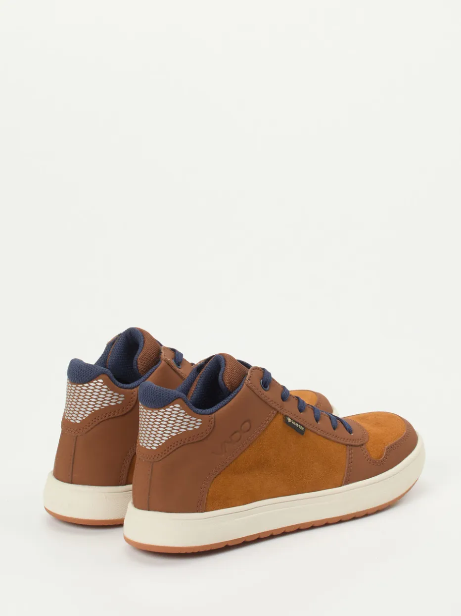 Für nasse Herbsttage und aktives Spielen.Vado verbindet in diesem Mid-Top-Sneaker Sportlichkeit und Funktionalität für Kinder. Mit seinem Obermaterial aus braunem Veloursleder, ergänzt durch marineblaue Kontrastschnürung und Mesh-Einsatz an der Ferse, bietet er eine markante Optik. Die integrierte GORE-TEX®-Membran schützt zuverlässig vor Nässe, während die profilierte Gummisohle mit Flex-Zone-System rutschhemmenden Halt gewährt. Die sportliche Silhouette und die gepolsterte Schaftpartie sorgen für angenehmen Tragekomfort – perfekt für Outdoor-Abenteuer bei jedem Wetter. Ideal kombinierbar mit wetterfester Funktionskleidung. Bietet zuverlässigen Nässeschutz und Flexibilität für bewegungsfreudige Kinderfüße.
