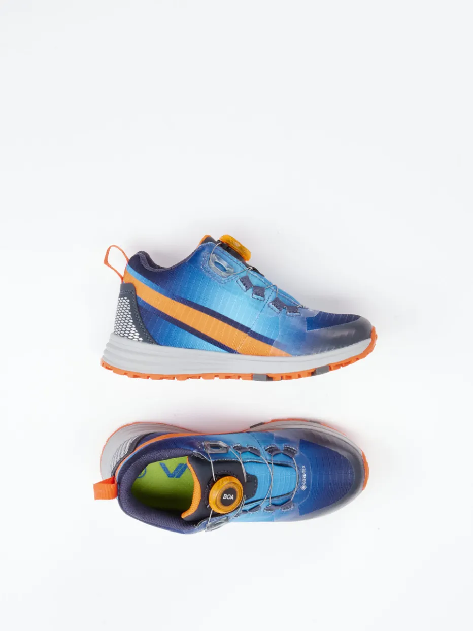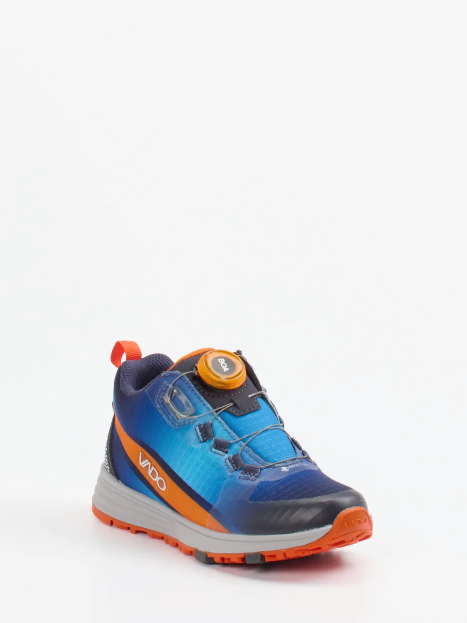 Farbstark durch jedes Abenteuer.Vado präsentiert mit diesem Kinder-Outdoor-Sneaker ein funktionales Modell für aktive Momente. Ob beim Toben im Park oder auf Familienwanderung – dieser leichte Sneaker überzeugt mit strapazierfähigem Textil-Material, ergänzt durch atmungsaktives Mesh. Ergänzt wird das sportliche Design durch ein markantes Colorblocking in Kobaltblau und Signalorange sowie reflektierende Details an der Ferse. Der praktische BOA-Drehverschluss erlaubt präzises Schnüren ohne Schleifen, während die griffige Profilsohle aus Gummi sicheren Halt auf unebenem Terrain bietet. Techwear-Einflüsse treffen hier auf kindgerechte Alltagstauglichkeit. Vado kombiniert Funktionalität mit urbaner Optik im Kindersegment.