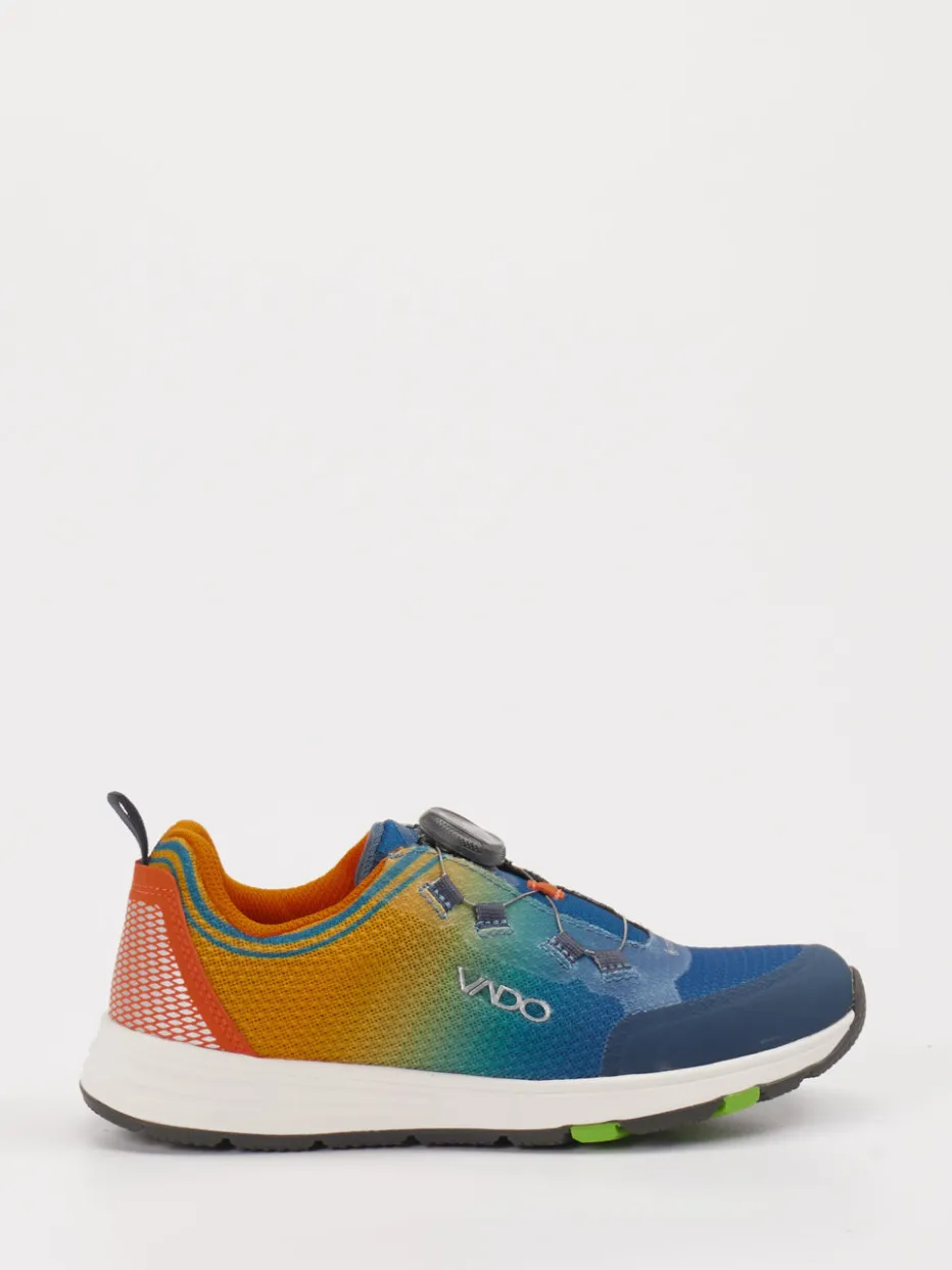 Der Vado Kindersneaker überzeugt als funktionales Leichtgewicht für den Alltag und Outdoor-Einsätze. Mit seinem atmungsaktiven Textilmaterial und der robusten Gummisohle bietet er optimalen Komfort bei jeder Bewegung. Das Obermaterial zeigt eine textilartige Oberfläche mit blauem Farbverlauf im Color-Blocking-Stil – Kontraste in Orange und Grün setzen markante Akzente. Reflektierende Elemente und das BOA-Drehverschlusssystem sorgen für sicheren Halt und einfache Handhabung. Die flexible Silhouette und das GORE-TEX-Material machen ihn zur wetterfesten Option für sportlich-lässige Looks. Ideal kombinierbar mit Outdoorjacke oder Funktionsrucksack. Technische Funktion trifft auf farbenfrohes Design – typisch Vado.