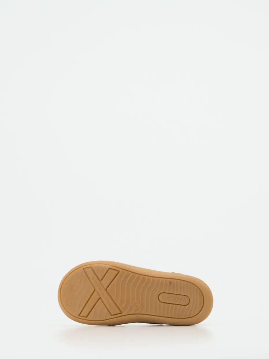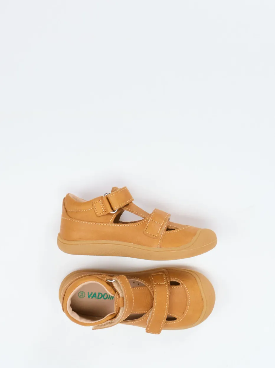 Stilvoller Schutz für kleine Füße.Vadolino präsentiert mit dieser geschlossenen Kinder-Sandale ein Modell für den aktiven Alltag. Die honigbraune Sandale aus robustem, samtig angeschliffenem Nubukleder punktet mit einem funktionalen Design: Cut-Outs an den Seiten sorgen für Belüftung, während die rutschhemmende Gummisohle mit Krabbelschutz auf unterschiedlichsten Untergründen sicheres Laufen ermöglicht. Zwei praktische Klettverschlüsse erleichtern das An- und Ausziehen und bieten optimale Passform. Der natürliche Farbton und die schlichte, runde Silhouette fügen sich ideal in den skandinavisch inspirierten Quiet-Luxury-Stil der Saison ein – besonders gut kombinierbar mit Naturtönen. Bequemer Tragekomfort gepaart mit kindgerechter Alltagstauglichkeit – typisch Vadolino.