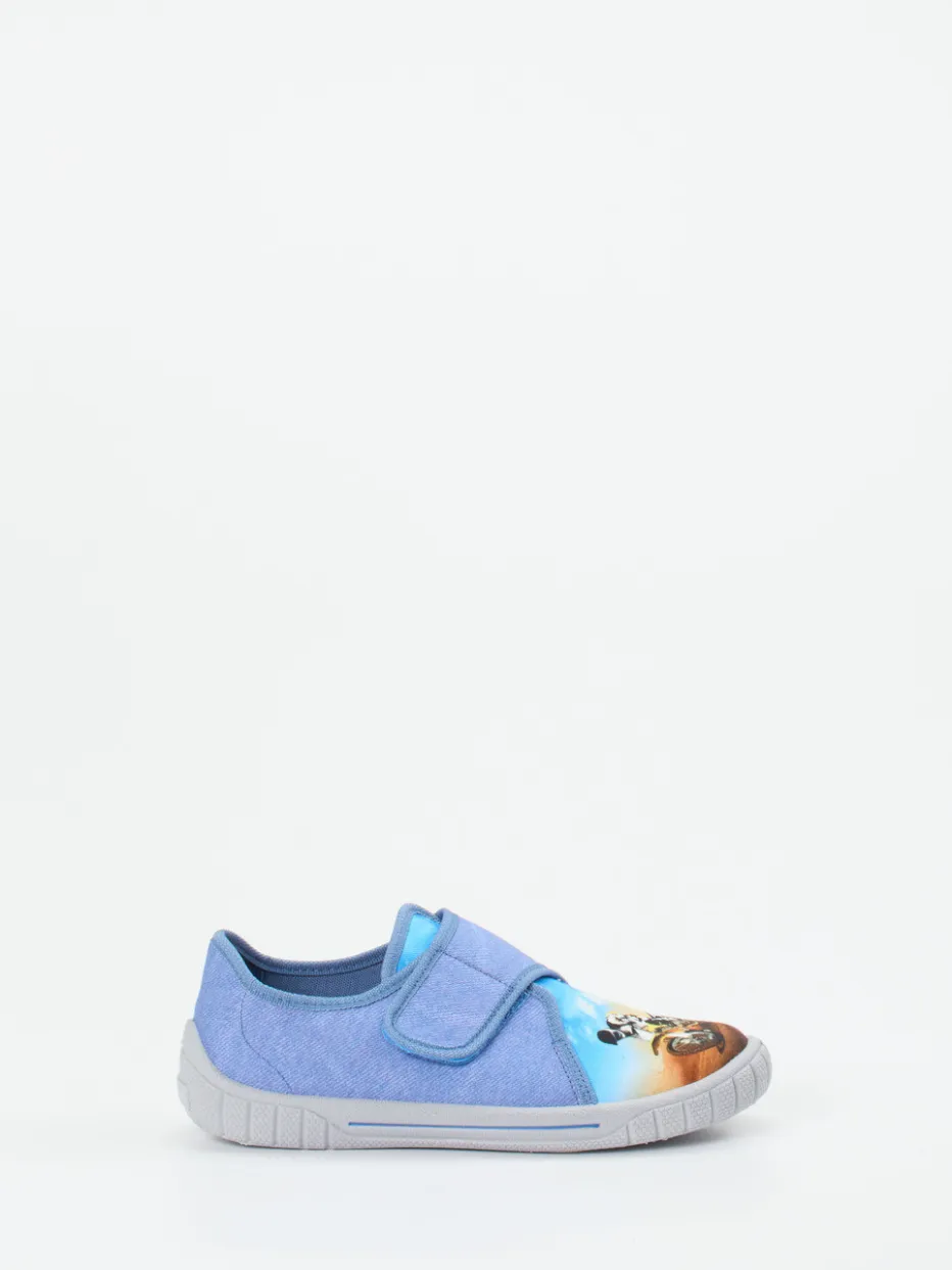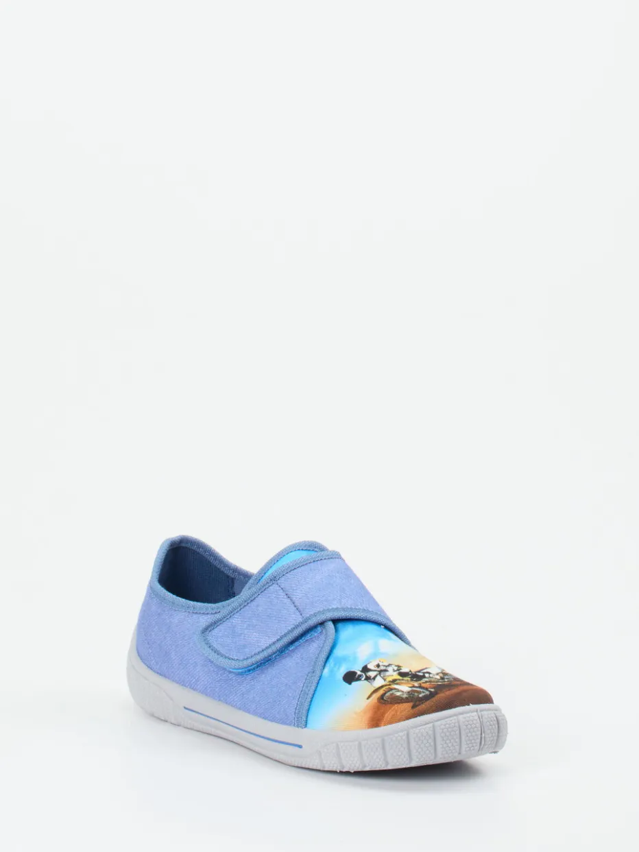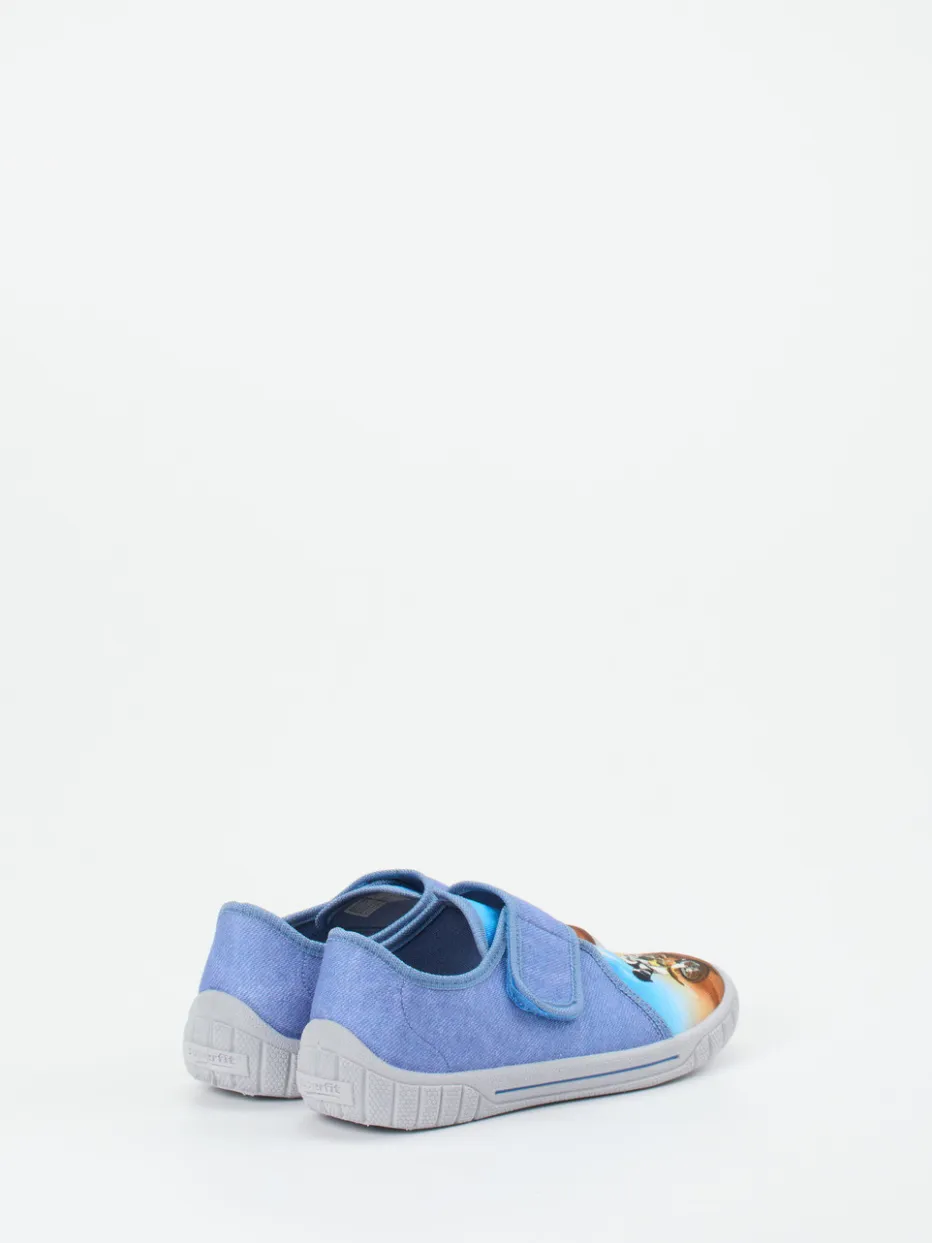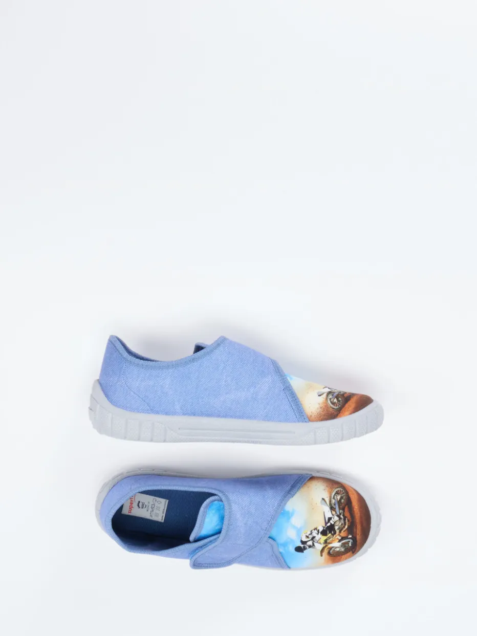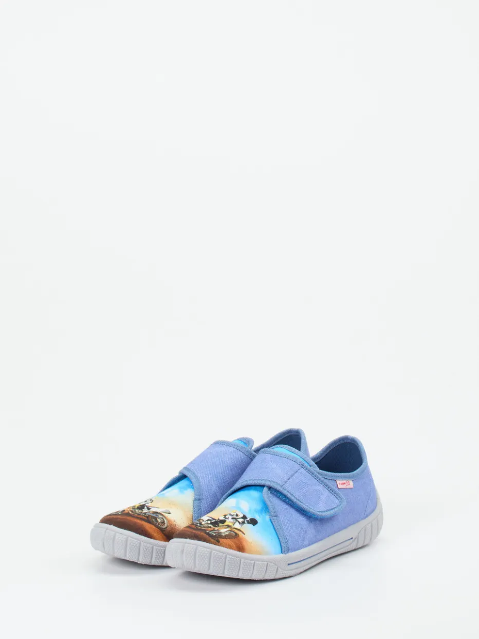 Rutschfest durchs Kinderzimmer.Superfit präsentiert mit diesem bequemen Kinderhausschuh ein Modell für Alltag und Zuhause. Ideal für junge Abenteurer kombiniert der Hausschuh jeansblaues, mattes Textil mit canvasartiger Struktur und einen actiongeladenen Motorrad-Motivdruck auf der Zehenkappe. Der praktische Klettverschluss erleichtert das An- und Ausziehen, während die hellgraue, rutschfeste PU-Gummisohle für sicheren Halt sorgt – auch auf glatten Böden. Die abgerundete Form und stabile Fersenkappe unterstreichen den Tragekomfort. Inspirierter Look aus dem Bereich Streetwear für Kinder. Ein funktionaler Alltagsbegleiter mit verspieltem Designansatz – klarer Superfit-Komfort für kleine Füße.